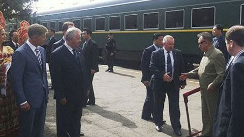 Đoàn tàu bọc thép chở nhà lãnh đạo Triều Tiên Kim Jong-il đến ga Khasan sau khi vượt qua biên giới giữa Triều Tiên và Nga, gần thành phố Vladivostok ở vùng Viễn Đông của Nga hôm 20/8.