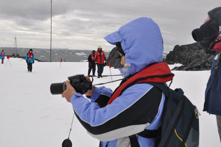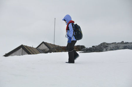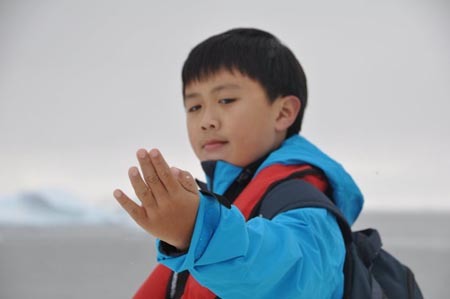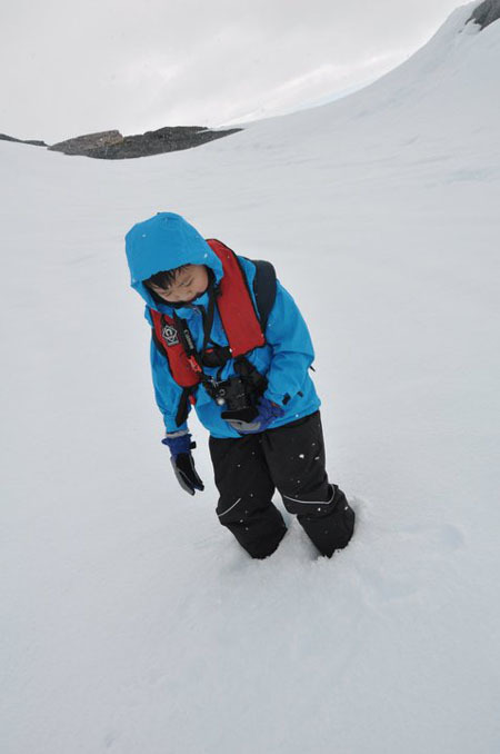 Thiều Quang giơ tay bắt lấy những bông tuyết rơi trên Nam cực