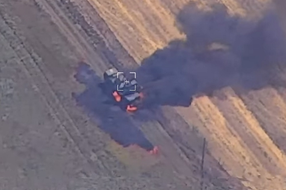 Vật thể được cho là xe tăng M1 Abrams Ukraine trúng đạn. Ảnh: Bộ Quốc phòng Nga/TASS