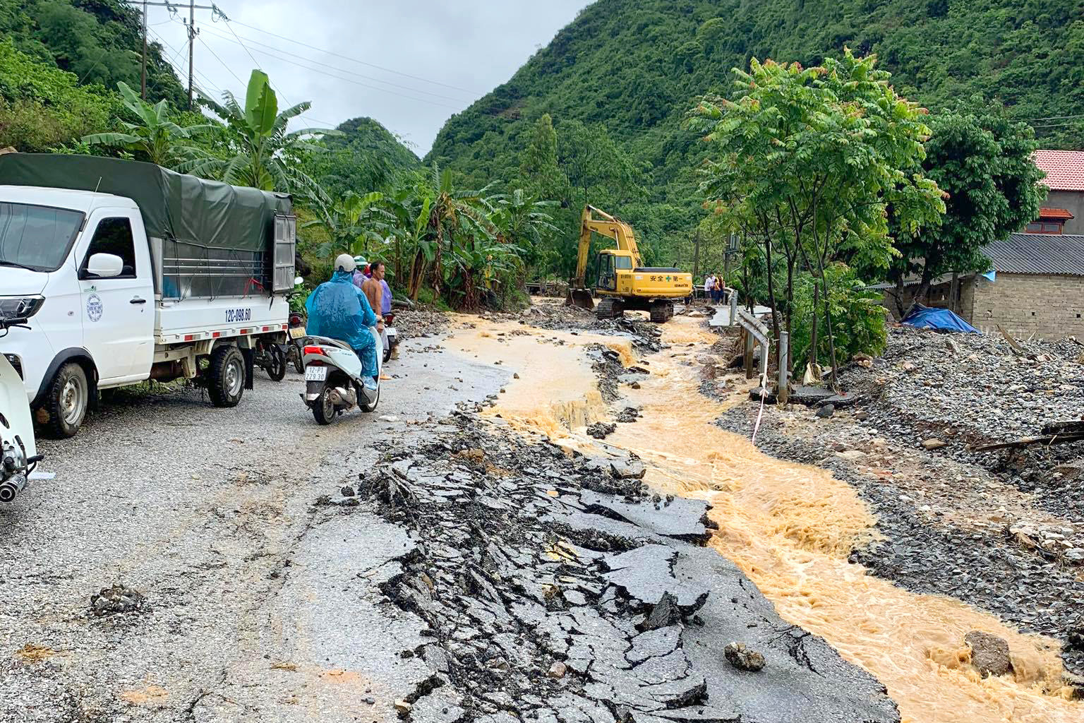 Sau cơn mưa lớn, nhiều tuyến đường ở huyện Chi Lăng, Lạng Sơn hư hỏng nặng, người dân phải dùng máy xúc dọn dẹp.