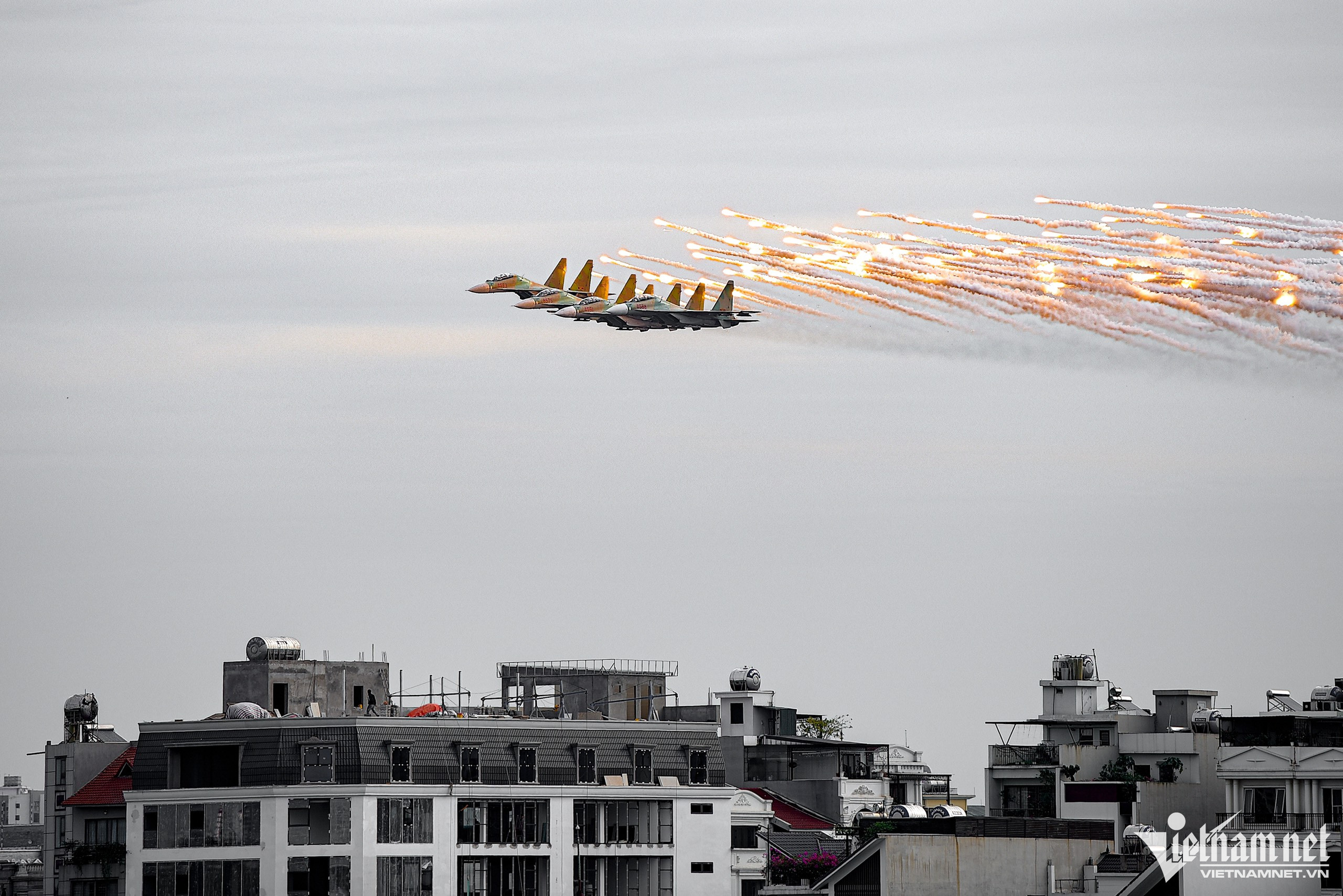 Những chiếc tiêm kích Su-30MK2 trình diễn bay ngang qua lễ đài. Tham gia trình diễn các phi công đến từ 2 Trung đoàn Không quân 927 (sân bay Kép, Bắc Giang) và Trung đoàn Không quân 923 (sân bay Thọ Xuân, Thanh Hóa).Đây là lần đầu tiên Bộ Quốc phòng tổ chức triển lãm đã thu hút được hơn 170 công ty, doanh nghiệp quốc phòng từ 30 quốc gia trên thế giới và các bộ, ngành Việt Nam cùng hơn 250 đoàn khách quốc tế, trong nước tham dự, trưng bày sản phẩm công nghiệp quốc phòng.Biên đội 4 chiếc Su-30MK2 bay vào vùng trời sân bay Gia Lâm (Hà Nội) trình diễn bắn đạn mồi bẫy. Đạn mồi bẫy trang bị trên hầu hết các chiến đấu cơ phản lực hiện đại được coi là một trong những tính năng đơn giản và rẻ tiền nhất để chống lại các tên lửa phòng không của đối phương. Hầu hết các loại tên lửa phòng không tầm thấp, tên lửa không đối không tầm ngắn và một số loại tầm trung dùng cơ chế dẫn đường hồng ngoại - sẽ dò đường theo nguồn nhiệt được phát ra từ động cơ máy bay. Vì vậy, khi tung ra đạn mồi bẫy với số lượng lớn sẽ tạo ra nhiều nguồn nhiệt trên đường bay của tên lửa khiến hệ thống dò mục tiêu của tên lửa bị loạn mục tiêu từ đó dẫn đến việc bay lệch hướng.Sau 3 lần trình diễn bắn đạn nhiễu bẫy tên lửa, bốn chiếc tiêm kích Su-30MK2 giải tán biên đội.