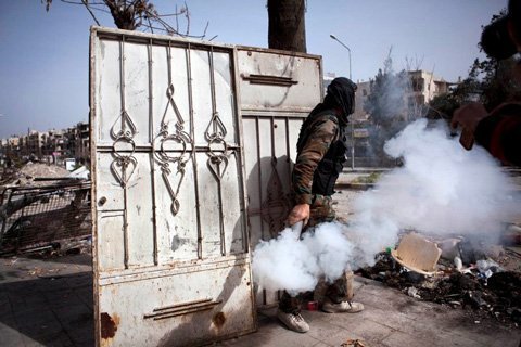 Một chiến binh lực lượng chống đối chuẩn bị quăng lựu đạn tự tạo vào quân đội Syria trong một cuộc giao tranh tại Aleppo, Syria. Ảnh EPA
