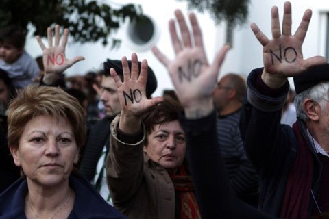 Bên ngoài tòa quốc hội, người dân Síp "nói không" với kế hoạch đánh thuế tiền gửi ngân hàng như một phần trong chuối các giải pháp để được EU "giải cứu". Ảnh Getty