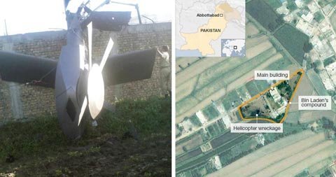 Hình ảnh bên trái cho thấy chiếc trực thăng được sử dụng trong vụ đột kích giết chết Osama bin Laden vào ngày 2 tháng 5 của quân đội Mỹ. Hình ảnh bên phải là hình ảnh về dinh thự của trùm khủng bố tại Abbottabad (Pakistan) được chụp qua vệ tinh Ikonos của GeoEye.