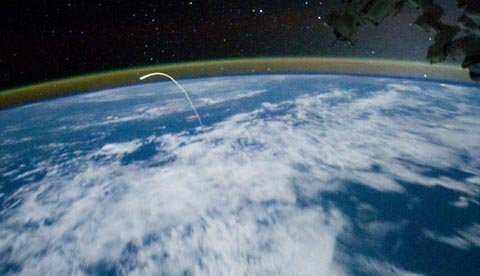 Hình ảnh tàu con thoi Atlantis trở về Trái Đất nhìn từ Trạm Không gian Quốc tế vào ngày 21 tháng 7 trông như một sao chổi băng qua bầu khí quyển.