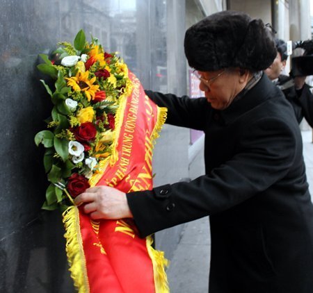 | Tổng bí thư đặt hoa tại Biển tưởng niệm Bác Hồ tại tòa nhà New Zealand, trên phố Hay market |