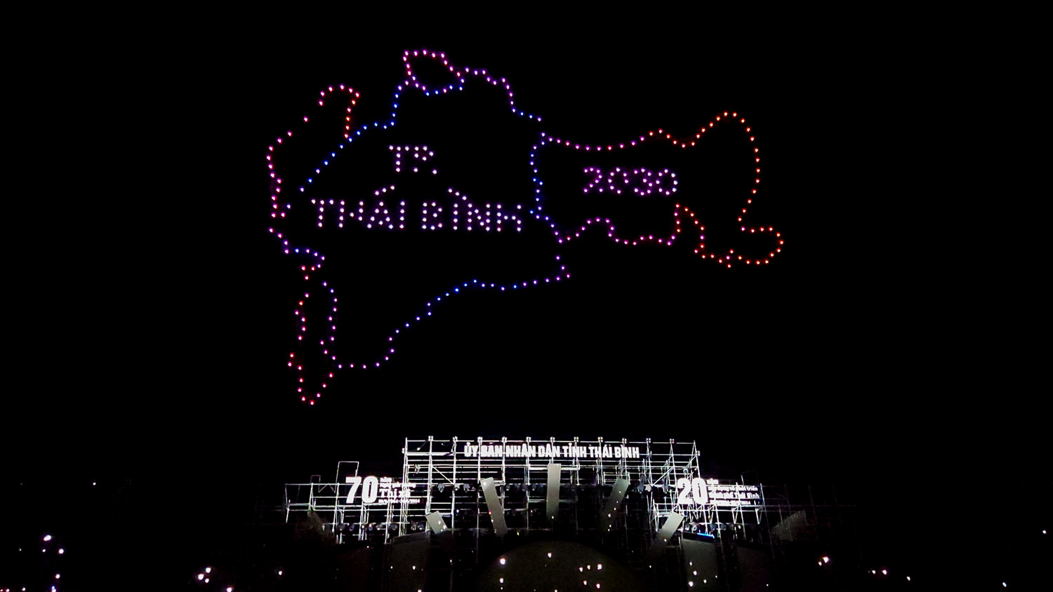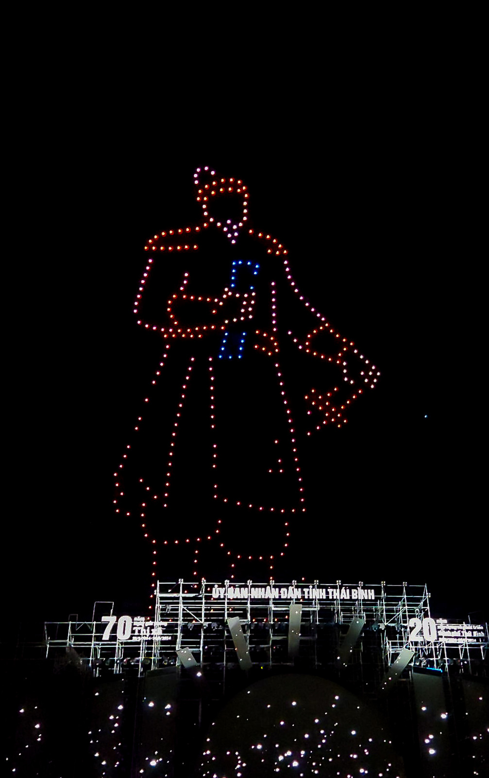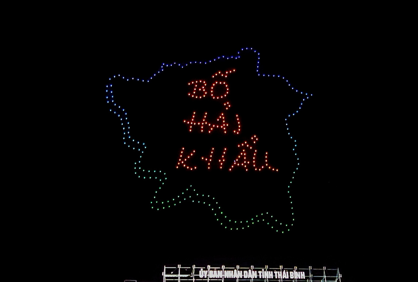 Trong buổi lễ, màn trình diễn drone được đông đảo người dân mong chờ, đây không chỉ là biểu diễn nghệ thuật bằng công nghệ hiện đại mà đó còn là cách kể lại những câu chuyện lịch sử, thành tựu vĩ đại đã đạt được và tương lai đầy hứa hẹn của thành phố như Bản đồ Bố Hải Khẩu, hình ảnh Tướng Minh Công Trần Lãm, hình ảnh Cầu Bo cũ, hình ảnh Chợ Bo, hình ảnh Tượng đài Mẹ Việt Nam anh hùng của Thái Bình, hình ảnh Rồng Việt bay lên, hình ảnh Bác Hồ kính yêu…