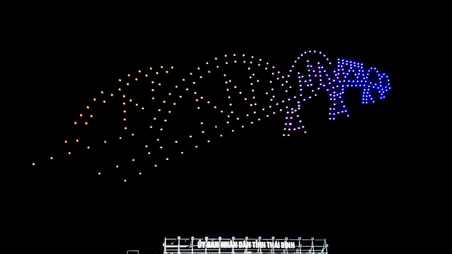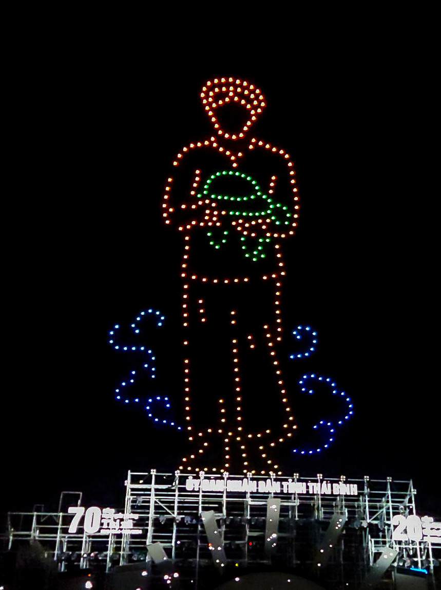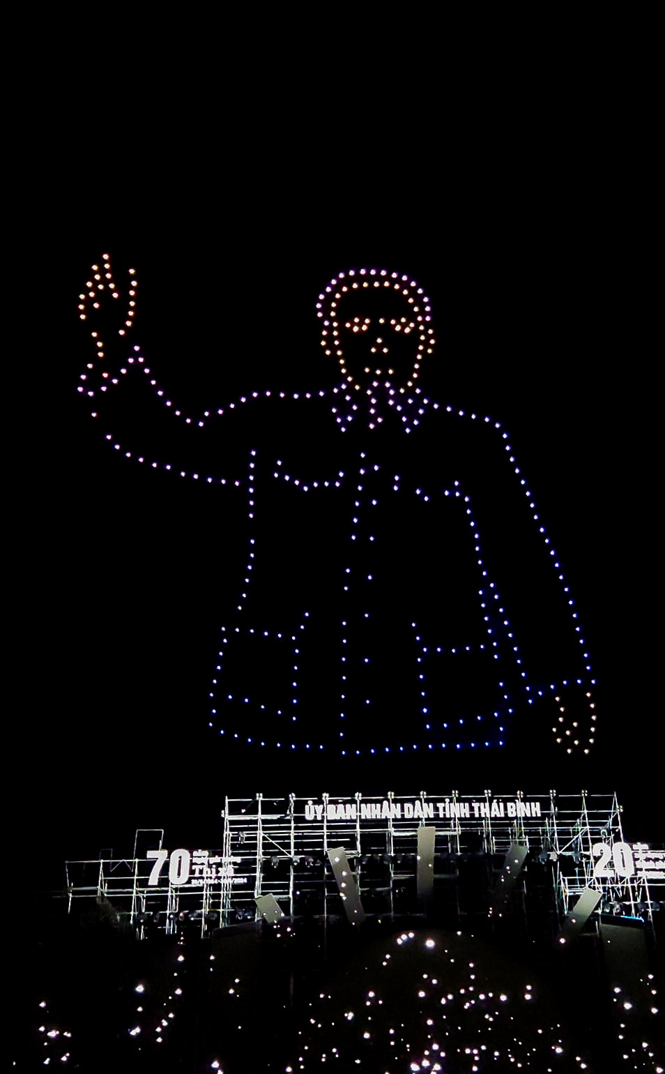 Trong buổi lễ, màn trình diễn drone được đông đảo người dân mong chờ, đây không chỉ là biểu diễn nghệ thuật bằng công nghệ hiện đại mà đó còn là cách kể lại những câu chuyện lịch sử, thành tựu vĩ đại đã đạt được và tương lai đầy hứa hẹn của thành phố như Bản đồ Bố Hải Khẩu, hình ảnh Tướng Minh Công Trần Lãm, hình ảnh Cầu Bo cũ, hình ảnh Chợ Bo, hình ảnh Tượng đài Mẹ Việt Nam anh hùng của Thái Bình, hình ảnh Rồng Việt bay lên, hình ảnh Bác Hồ kính yêu…