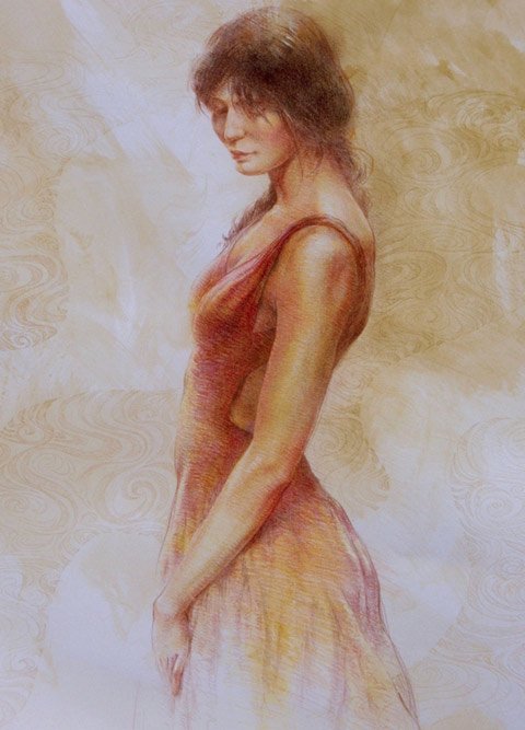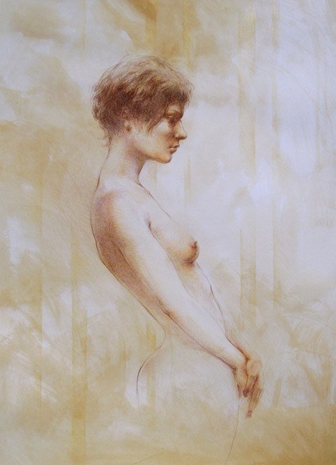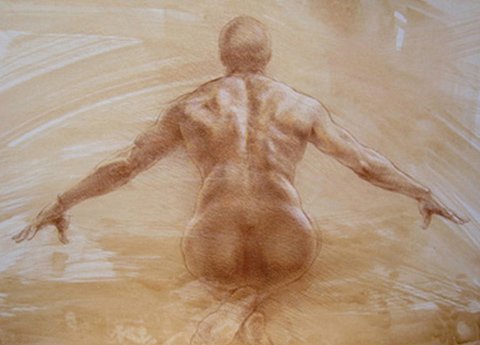 Tranh hình họa của Nguyễn Huy Khuê nghiêng về vẽ cơ thể học, nhưng vẫn bật lên cái hồn rất rõ của nhân vật. Một phụ nữ khỏa thân, một thân hình xoay ngược, một đôi tay xoắn chặt, một chiếc đầu với đôi chân mày cau lại, không chỉ là cơ bắp và cấu trúc của cơ thể, mà còn toát ra năng lượng hừng hực từ làn da của nhân vật.