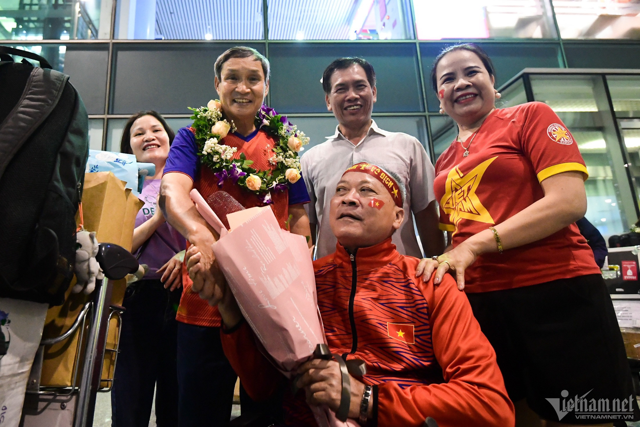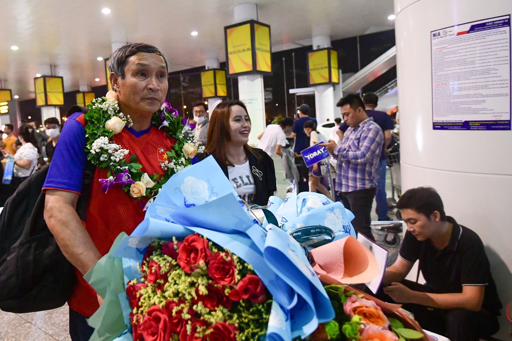 Phó Tổng cục trưởng Tổng cục TDTT Trần Đức Phấn (áo màu cát), người từng có nhiều kinh nghiệm giữ chức Trưởng đoàn thể thao trong nhiều kỳ SEA Games cũng như nhiều đại hội thể thao lớn khác mà Việt Nam tham dự trước đây đã tới sân bay đón và chúc mừng ban huấn luyện và các thành viên tuyển bóng đá nữ.