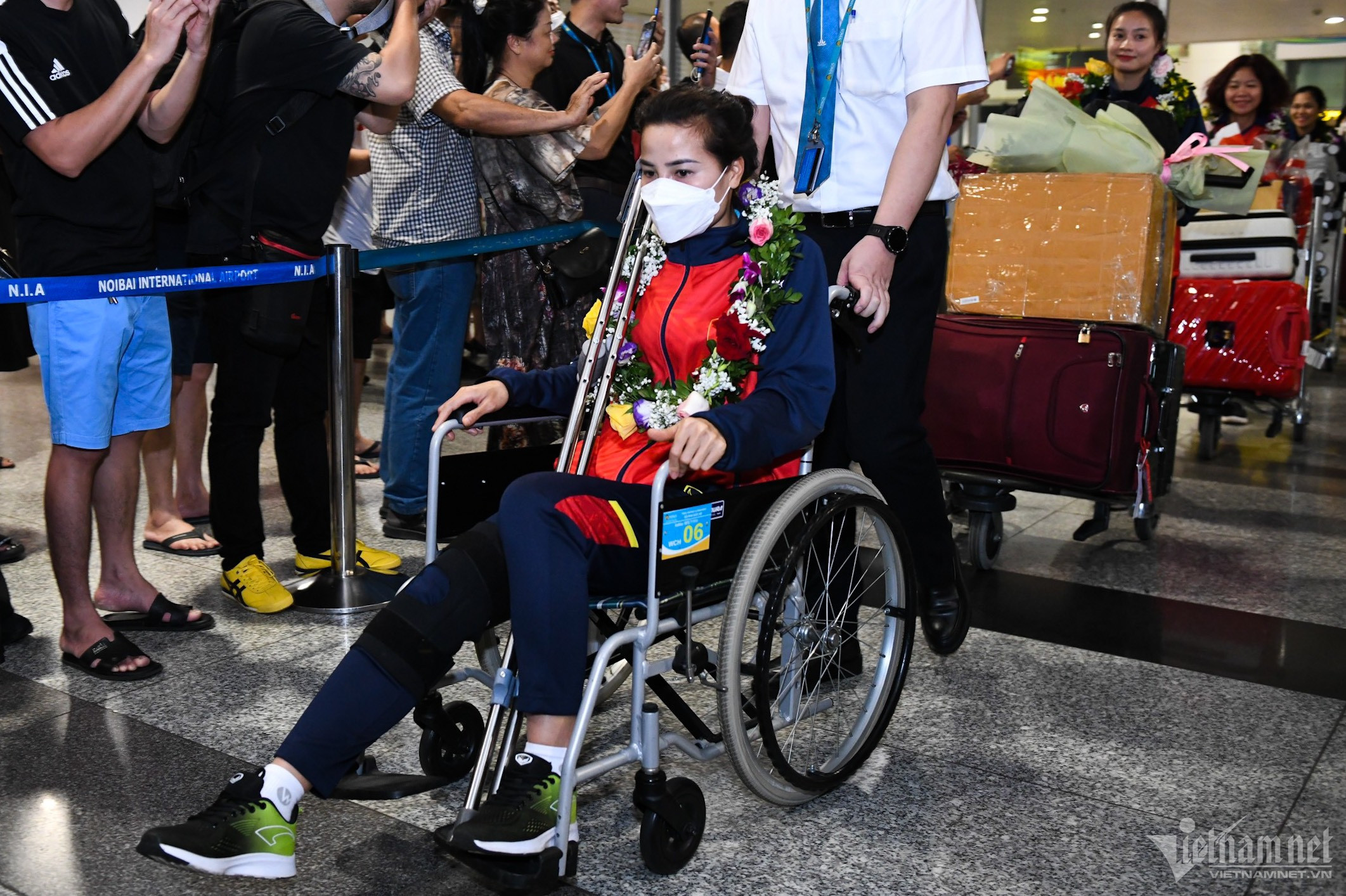 Hậu vệ Trần Thị Thúy Nga phải ngồi xe lăn ra cửa nhà ga. Trước đó, trong hiệp 1 trận chung kết, cô bị chấn thương trong một pha va chạm với cầu thủ đối phương.
