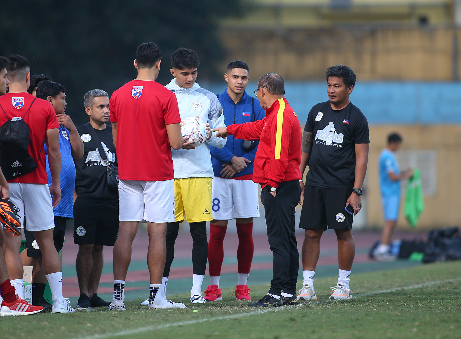 Khi buổi tập của tuyển Philippines còn chưa kết thúc, HLV Park Hang Seo và các cầu thủ Việt Nam đã có mặt trên SVĐ Hàng Đẫy. Đây là buổi tập duy nhất làm quen sân thi đấu của tuyển Việt Nam. Trước trận đấu, HLV Park cho biết ông muốn cuộc đọ sức với đối thủ phải "kín" để tránh bị lộ bài, nhưng VFF lại bán vé cho người hâm mộ vào sânTrong buổi tập, khi phát hiện ra một số cầu thủ Philippines quan tâm tới trái bóng của tuyển Việt Nam đang tập, ông Park có hành động rất bất ngờChiến lược gia người Hàn Quốc đá trái bóng về phía đội Philippines đang tập trung ở ngoài sânHLV Park thậm chí còn chỉ ra những đặc tính của trái bóng sẽ được sử dụng ở AFF Cup 2022Thuyền trưởng tuyển Việt Nam rất cởi mở với các cầu thủ PhilippinesÔng Park thậm chí còn chào các cầu thủ đội khách và chúc cho tuyển Philippines thi đấu tốt trong trận giao hữu với tuyển Việt NamTrở lại buổi tập, HLV Park Hang Seo tỏ ra khá đăm chiêu khi AFF Cup đang tới gần. Đây là giải đấu cuối cùng trên cương vị thuyền trưởng tuyển Việt Nam của ông thầy người Hàn QuốcVăn Hậu tập riêng ở ngoài sân, dù vậy hậu vệ này không gặp chấn thương nặngHoàng Đức cũng phải tập riêng với bác sĩVăn Lâm nhiều khả năng được bắt chính trong trận gặp Philippines. Ở trận tuyển Việt Nam thắng CLB Dortmund, hai thủ môn ra sân là Văn Toản và Văn HoàngTuyển Việt Nam hiện tại đang có 28 cầu thủTrận giao hữu giữa tuyển Việt Nam vs Philippines diễn ra vào lúc 18h ngày 14/12 trên SVĐ Hàng Đẫy, được coi là màn tổng duyệt với cả hai đội trước AFF Cup 2022.