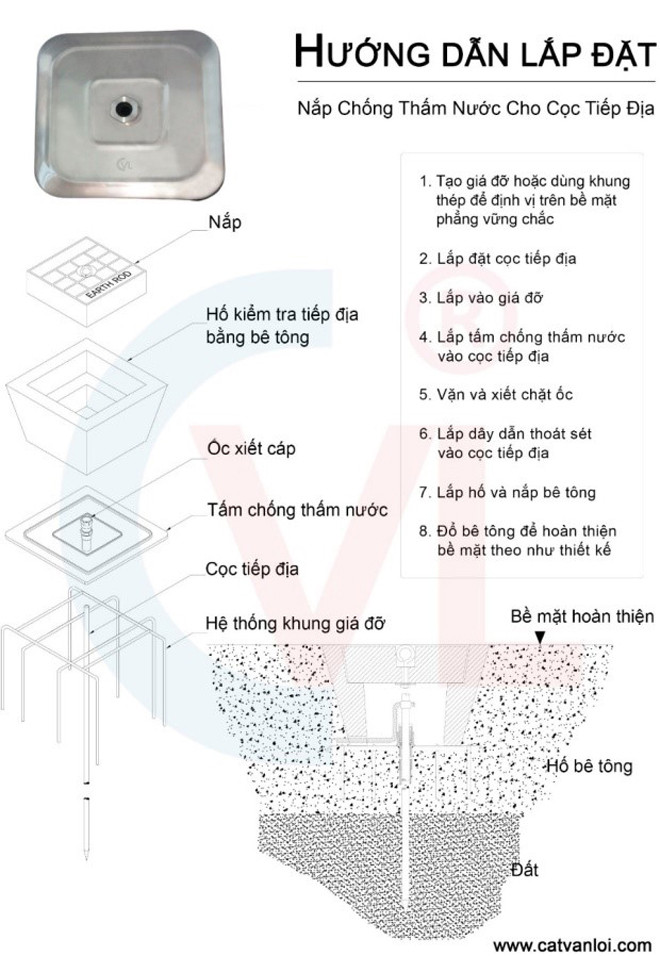 Hố kiểm tra tiếp địa bằng bê tông CVL được sử dụng chung với tấm chống thấm nước bằng inox SUS 304 (copper earthing electrode water sealing gland) nhằm ngăn dòng nước xâm nhập. Hố thường được lắp đặt ngoài trời, trên đường đi có phương tiện di chuyển.