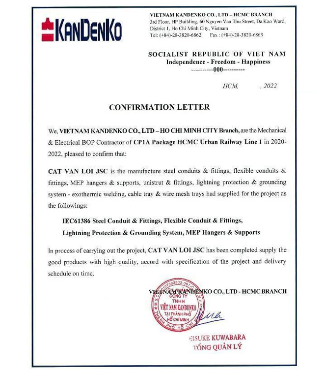Đại diện Cát Vạn Lợi cho biết, các sản phẩm chống sét - hố kiểm tra tiếp địa CVL được kiểm soát bởi hệ thống quản lý chất lượng ISO 9001:2015, đảm bảo sự đồng nhất về chất lượng, đạt tiêu chuẩn quốc tế. Các sản phẩm được các nhà thầu cơ điện lựa chọn sử dụng thay thế hàng nhập khẩu tại các công trình như: Thủ Thiêm River Park (quận 2, TP.HCM), chung cư Imperia Smart City (Hà Nội), chung Cư Sky View (Bình Dương), tòa nhà Becamex (Bình Dương), khu du lịch cao cấp Laimian Quy Nhơn (Bình Định)… Bên cạnh đó, Cát Vạn Lợi còn cung ứng các sản phẩm vật tư cơ điện cho công ty Kandenko để thi công dự án tuyến đường sắt đô thị TP.HCM Bến Thành - Suối Tiên.