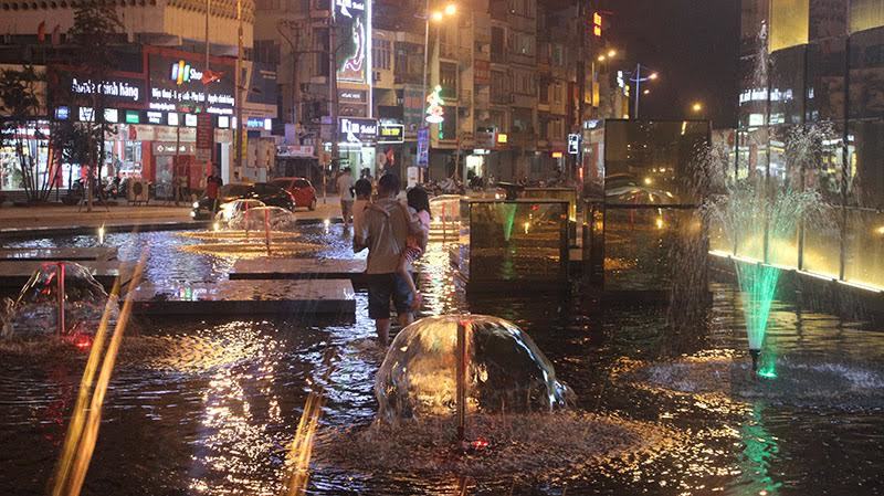 Theo quan sát, mọi người dựng xe máy ngay tại lòng đường, các em nhỏ vô tư chạy nhảy dưới hồ nước, các cặp đôi lội xuống nước để chụp ảnh. Điều đáng nói, phía dưới hồ nước là hệ thống điện để vận hành máy phun nước, càng nguy hiểm hơn khi hồ nước đã mọc rêu, dễ gây trơn trượt đối với trẻ nhỏ.