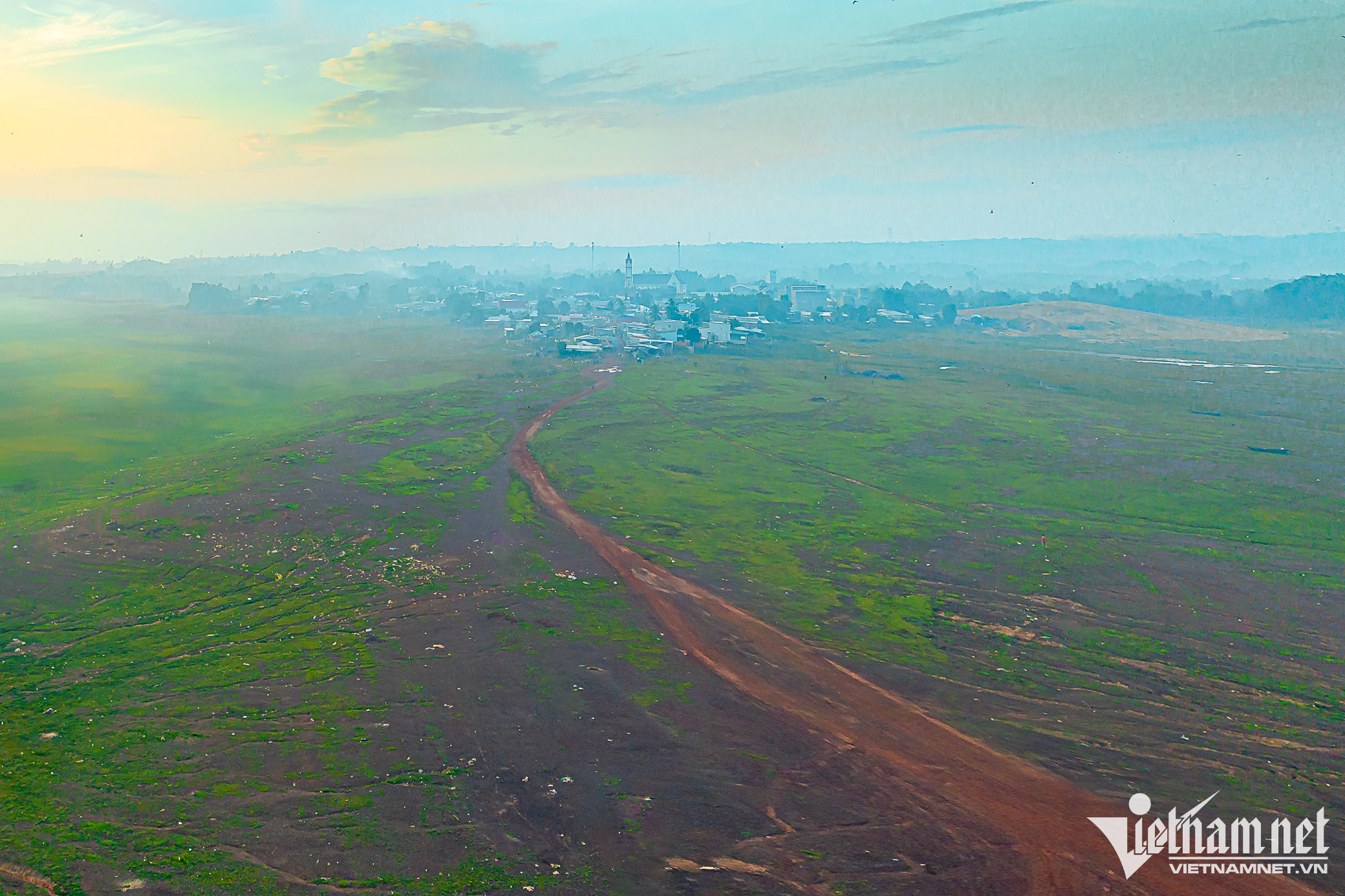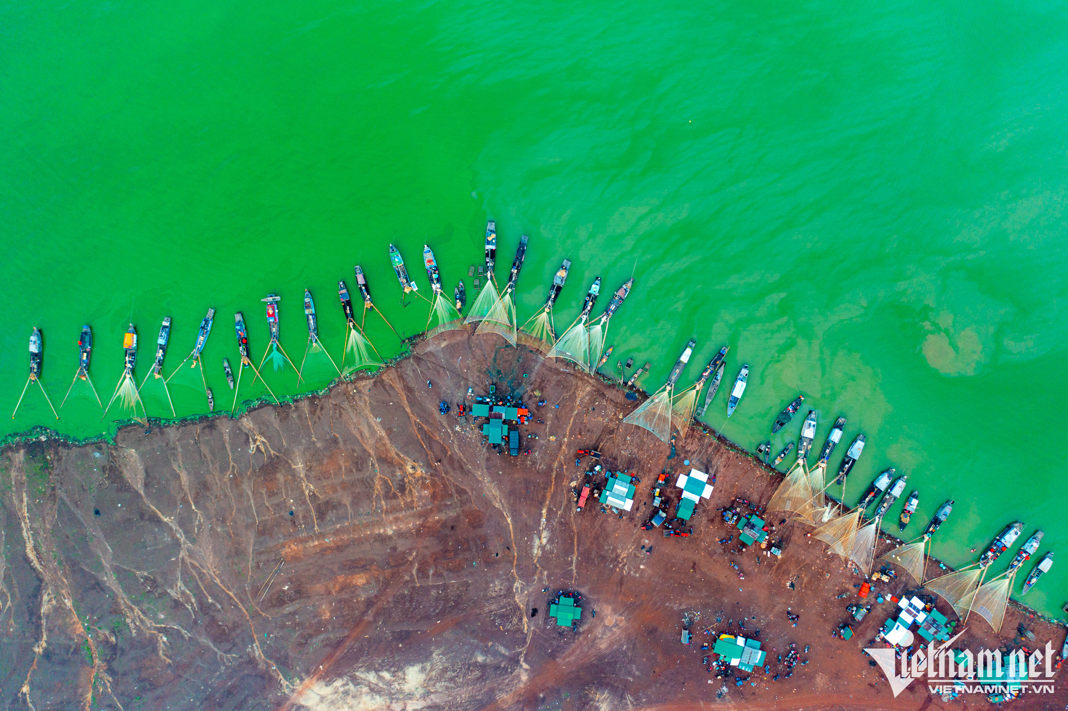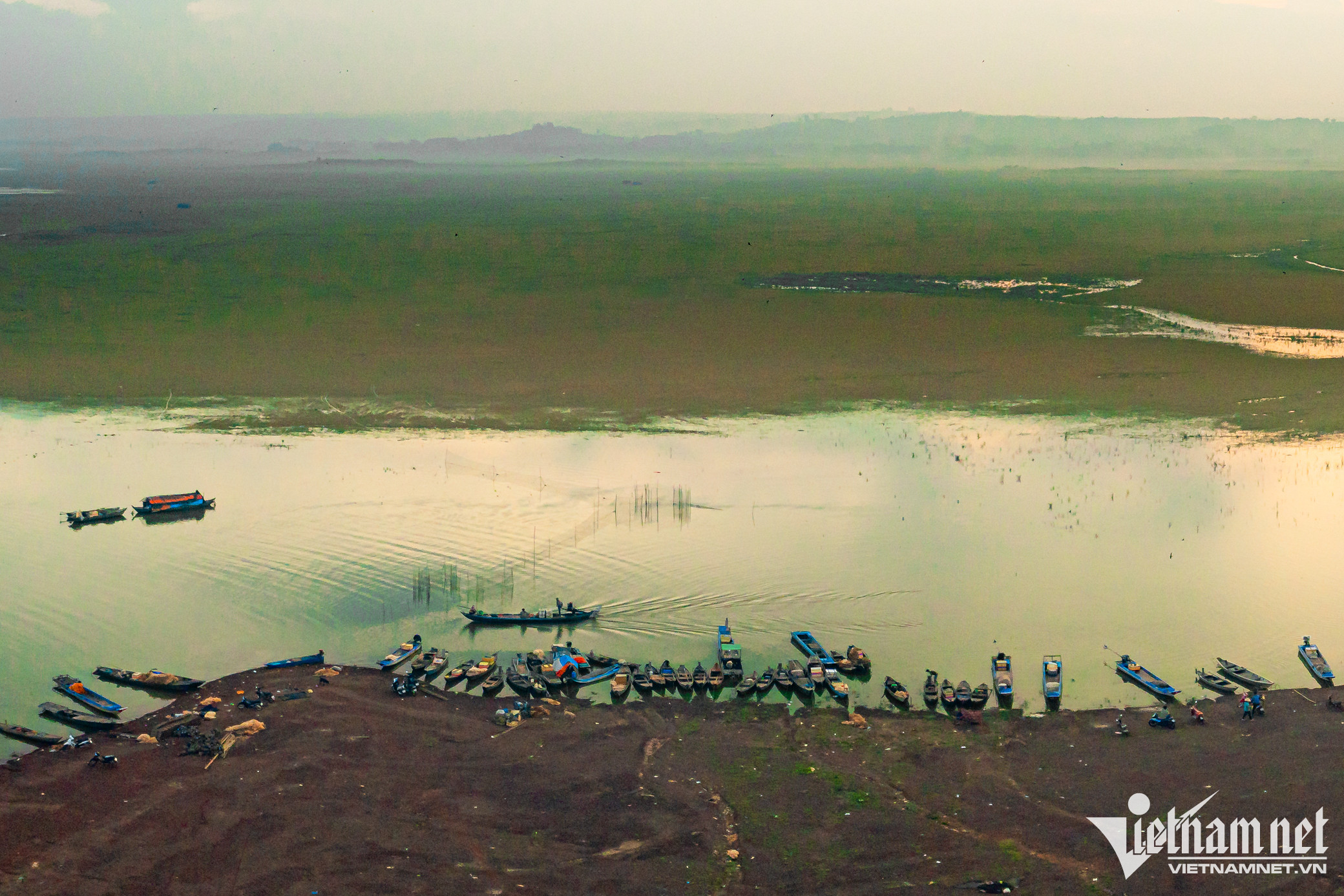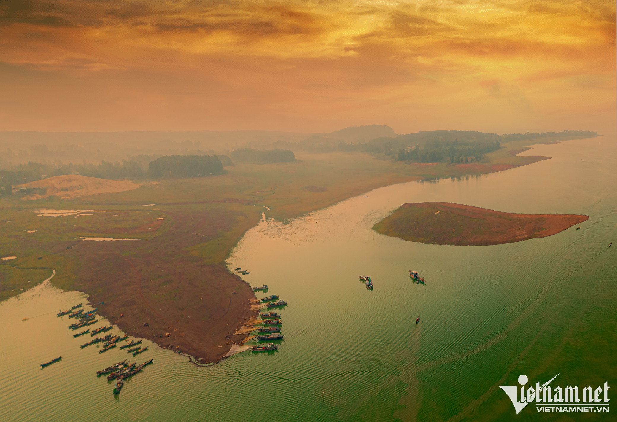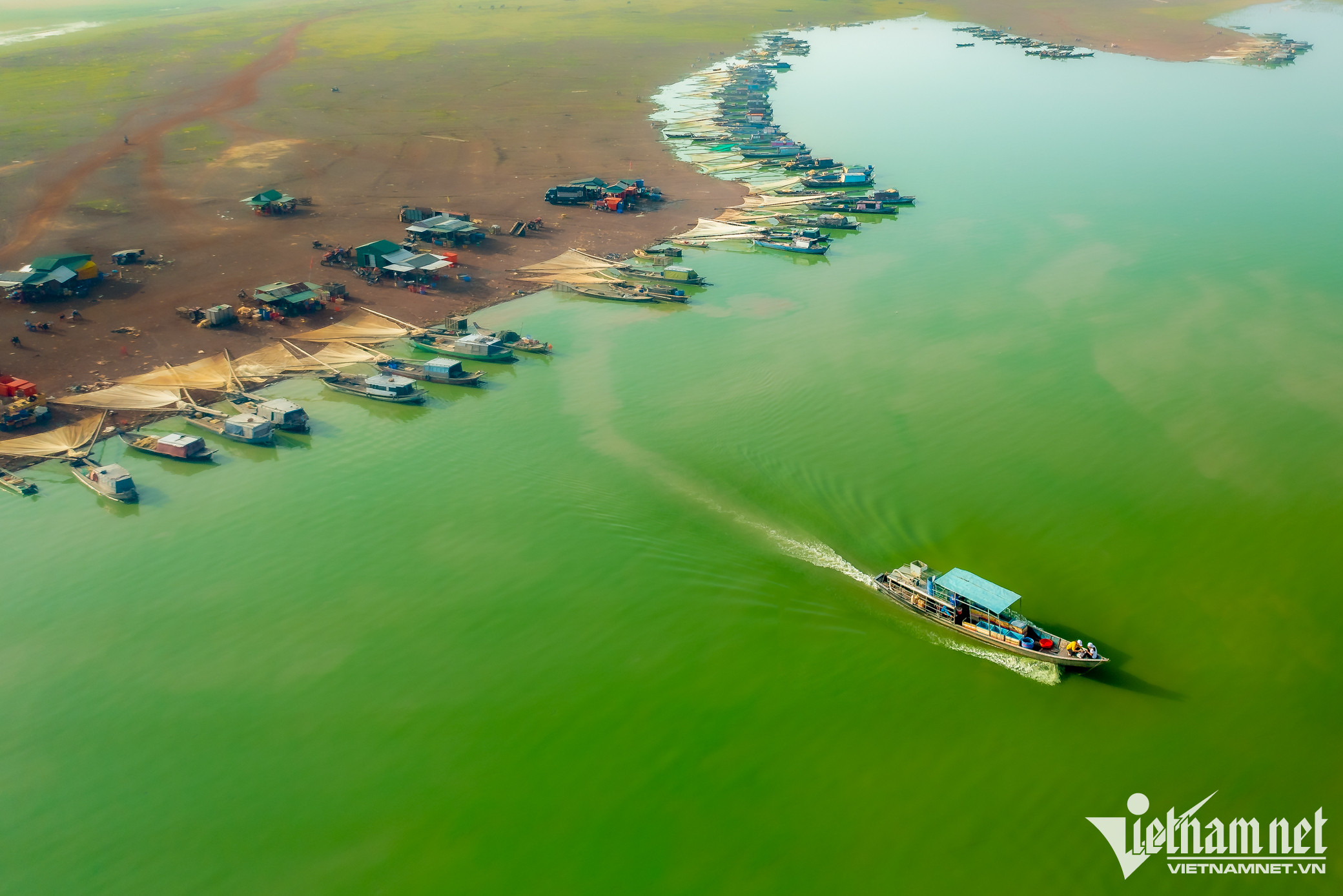 Những chiếc thuyền đánh bắt thủy sản trên hồ Trị An được ngư dân neo đậu sát nhau quanh bờ để phơi lưới. Dải đất màu nâu, tương phản với màu xanh ngắt của tảo, tạo khung cảnh nên thơ.