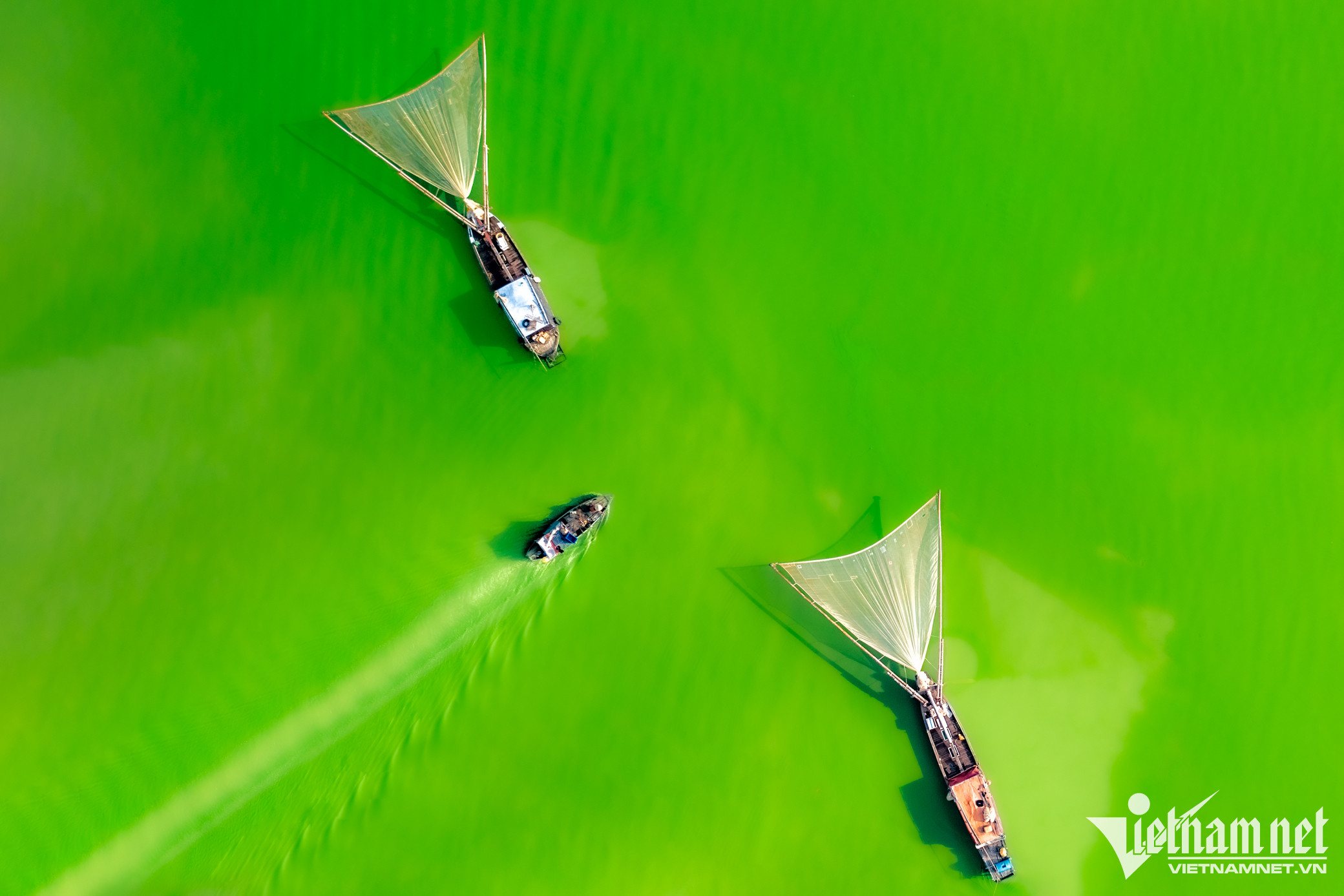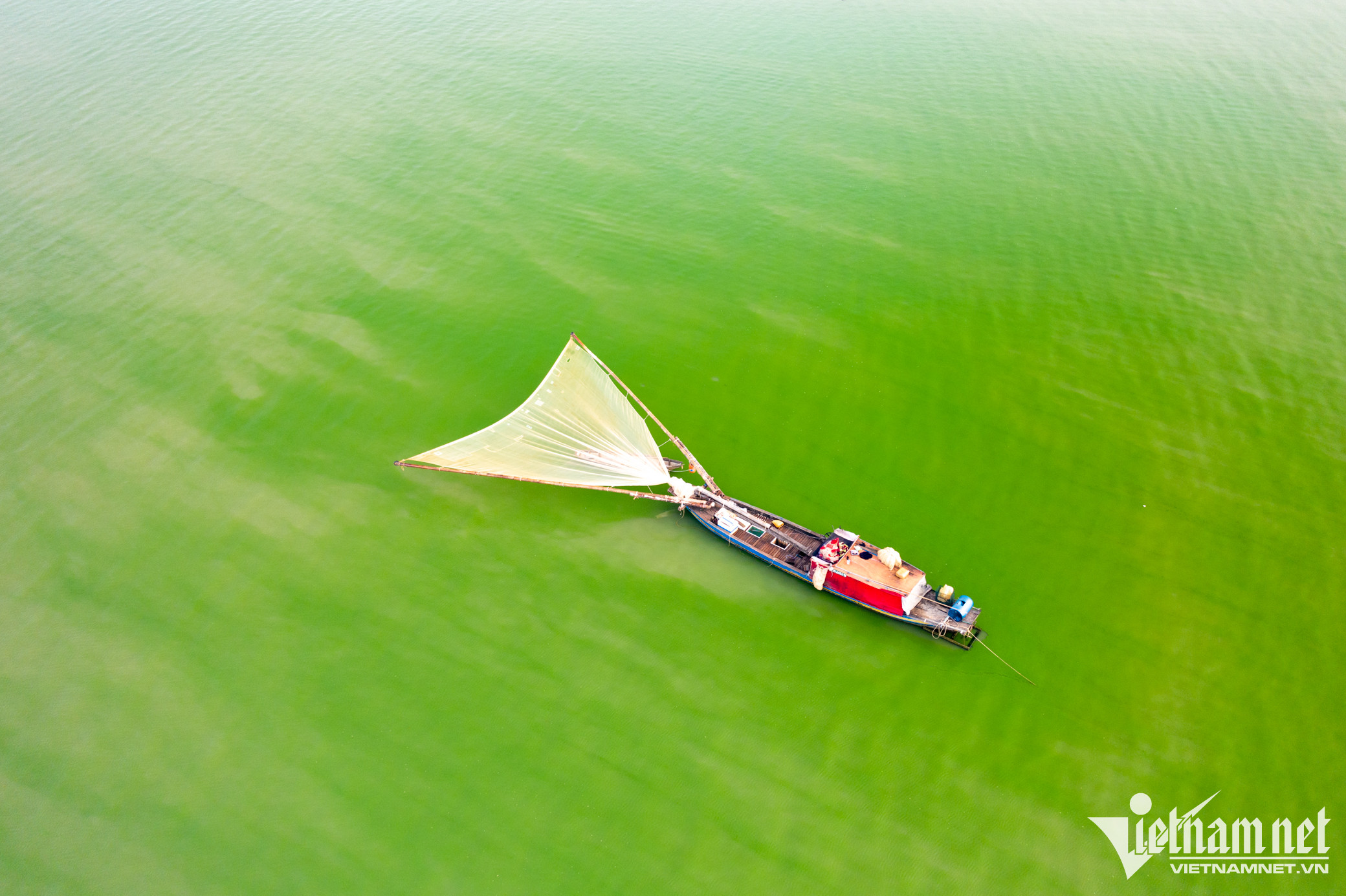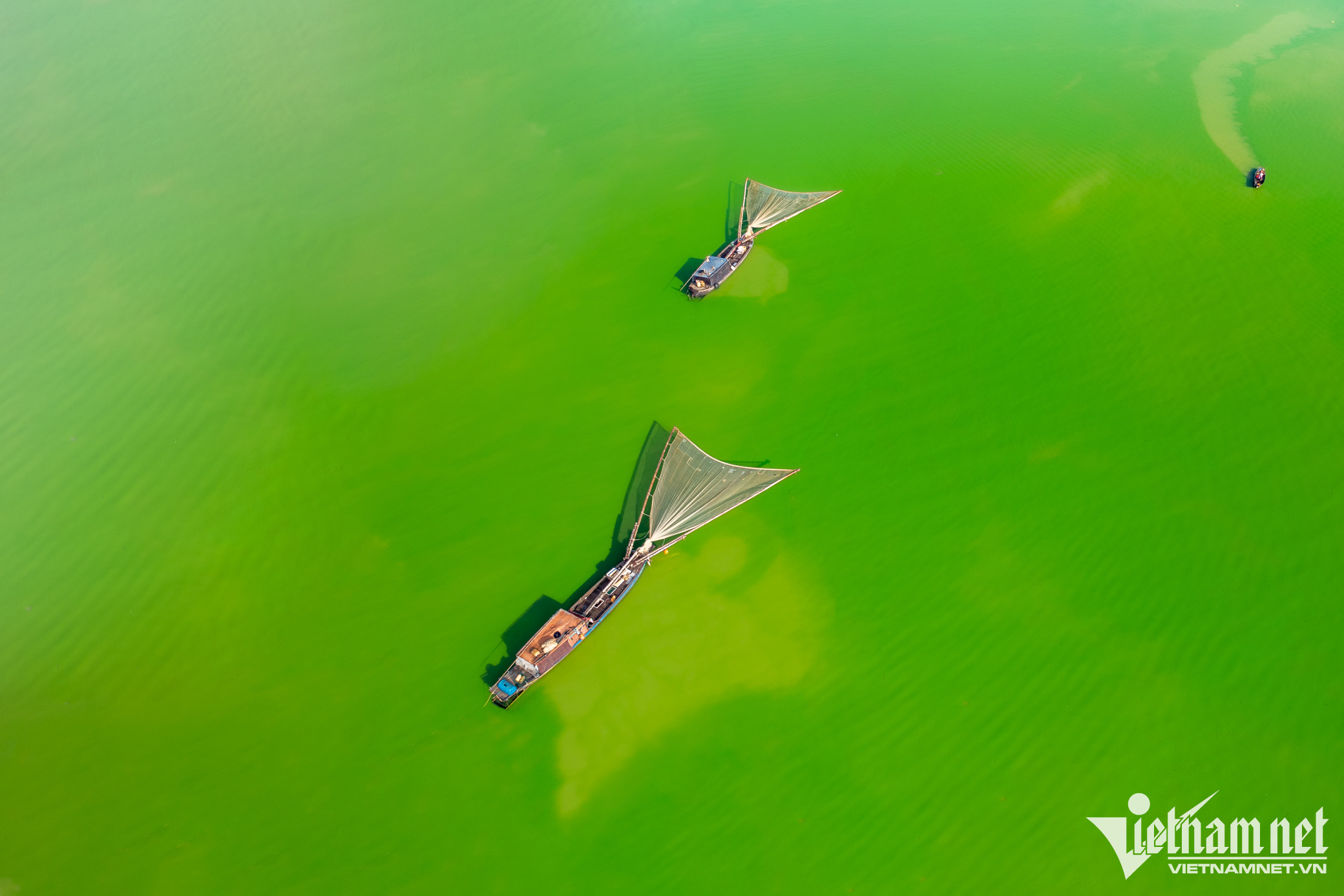 Tảo lục khu vực này “nở hoa”, phát triển dày và hiện lên xanh nhất trong những ngày nắng, đặc biệt nó nổi bật cùng những chiếc ghe khi dải lưới giăng ra tạo hình đuôi cá.