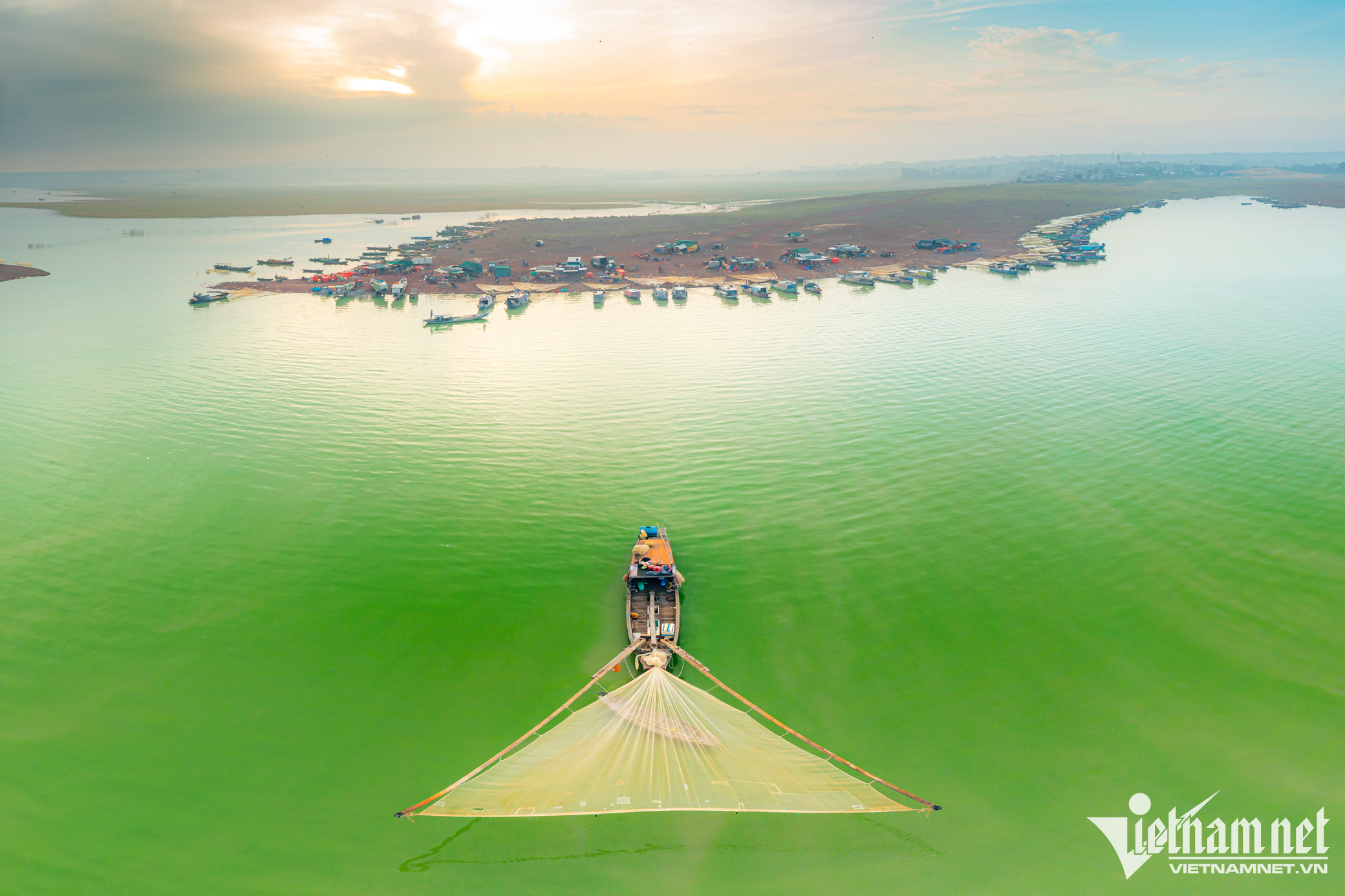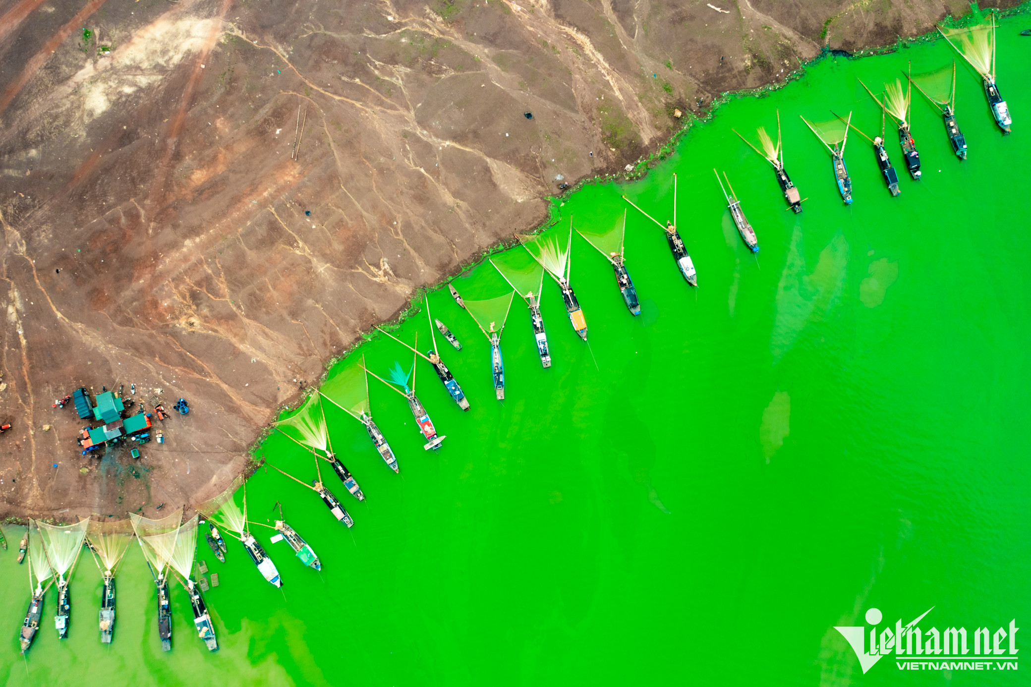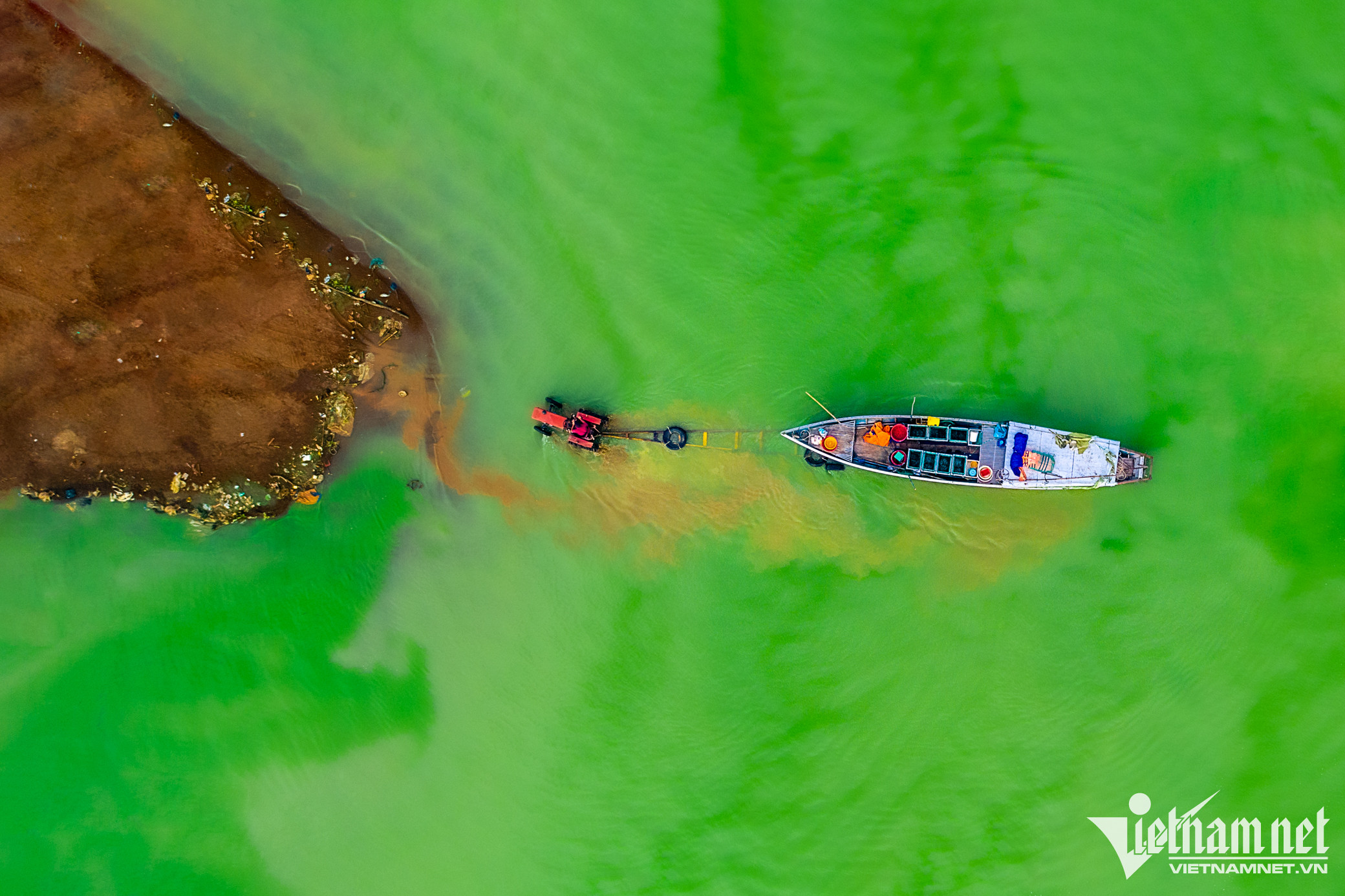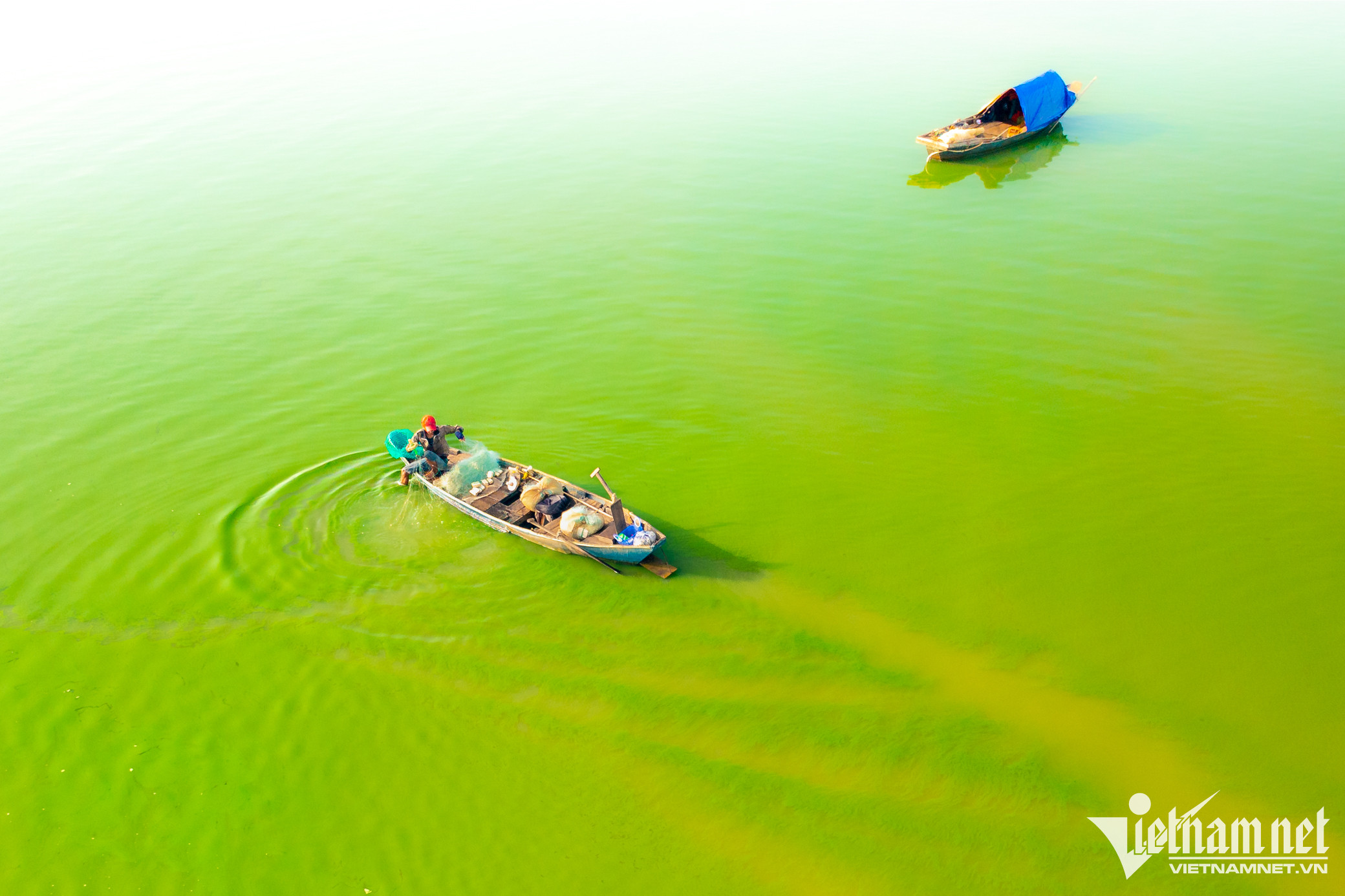 Tảo lục khu vực này “nở hoa”, phát triển dày và hiện lên xanh nhất trong những ngày nắng, đặc biệt nó nổi bật cùng những chiếc ghe khi dải lưới giăng ra tạo hình đuôi cá.