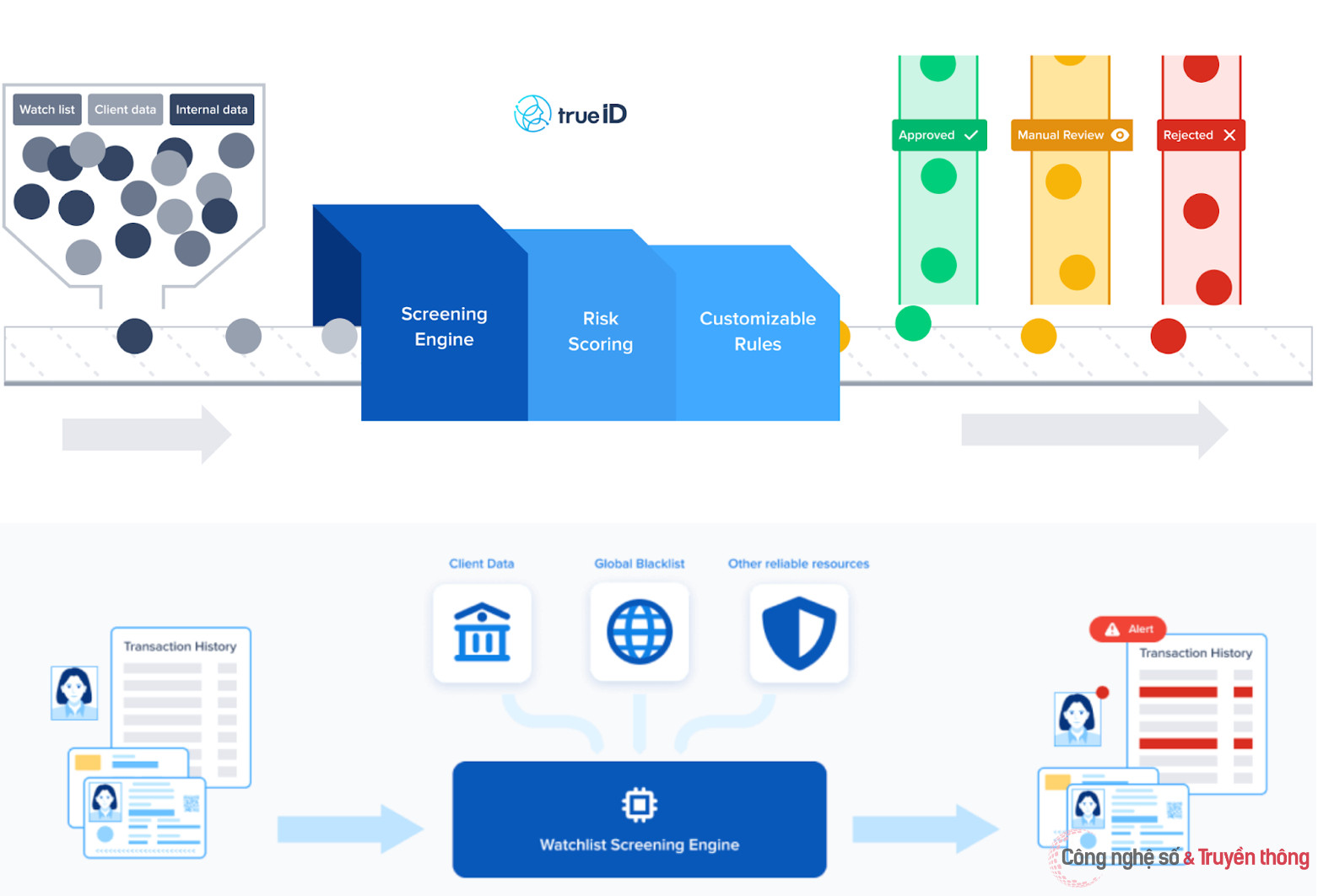 Cụ thể, với AML Screening, giải pháp kiểm tra thông tin phòng chống rửa tiền, doanh nghiệp sẽ được tiếp cận kho dữ liệu đáng tin cậy được TrueID tổng hợp và cập nhật tự động liên tục từ các nguồn chính thống về danh sách đối tượng rửa tiền và có nguy cơ rửa tiền ở Việt Nam và quốc tế. Hệ thống cho phép tra soát và đối chiếu nhanh chóng giữa thông tin khách hàng cá nhân hoặc doanh nghiệp với danh sách theo dõi của Ngân hàng Nhà nước Việt Nam, các tổ chức quốc tế như Liên Hợp Quốc, Bộ Tài chính Hoa Kỳ,... Kết quả được trả về chỉ trong vài giây, giúp doanh nghiệp nhận biết lập tức nếu khách hàng tiềm năng đó có thể là đối tượng nghi ngờ.