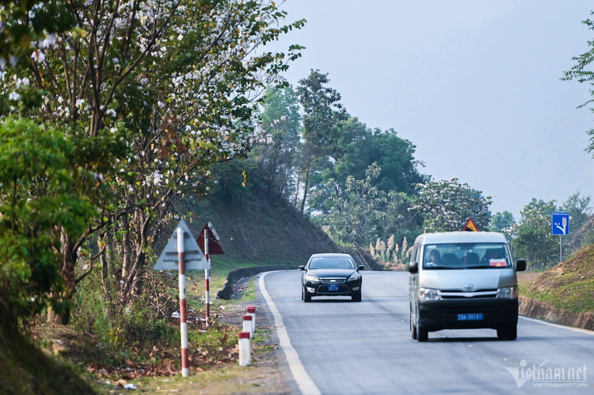 Trên đường từ Hà Nội lên Điện Biên, du khách được chiêm ngưỡng những rặng hoa ban nở trắng bên đèo Pha Đin.