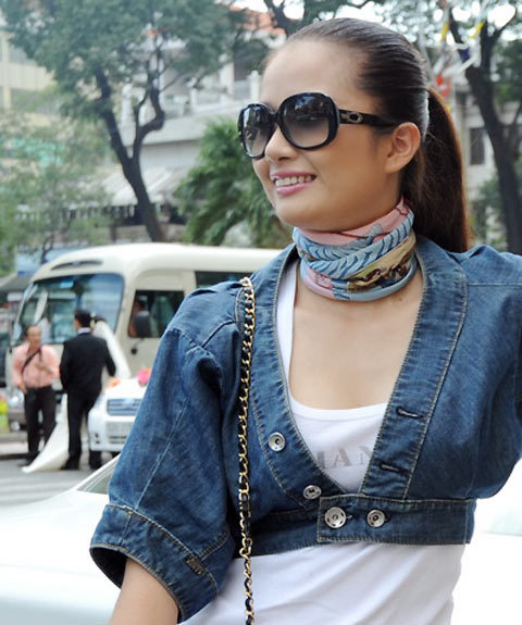 Trong trang phục jean trẻ trung cùng những phụ kiện hài hòa, diễn viên, hoa hậu Cao Thùy Dương đẹp hiện đại giữa khung cảnh cổ kính của Nhà thờ Đức Bà và tòa nhà Bưu điện TP.HCM.