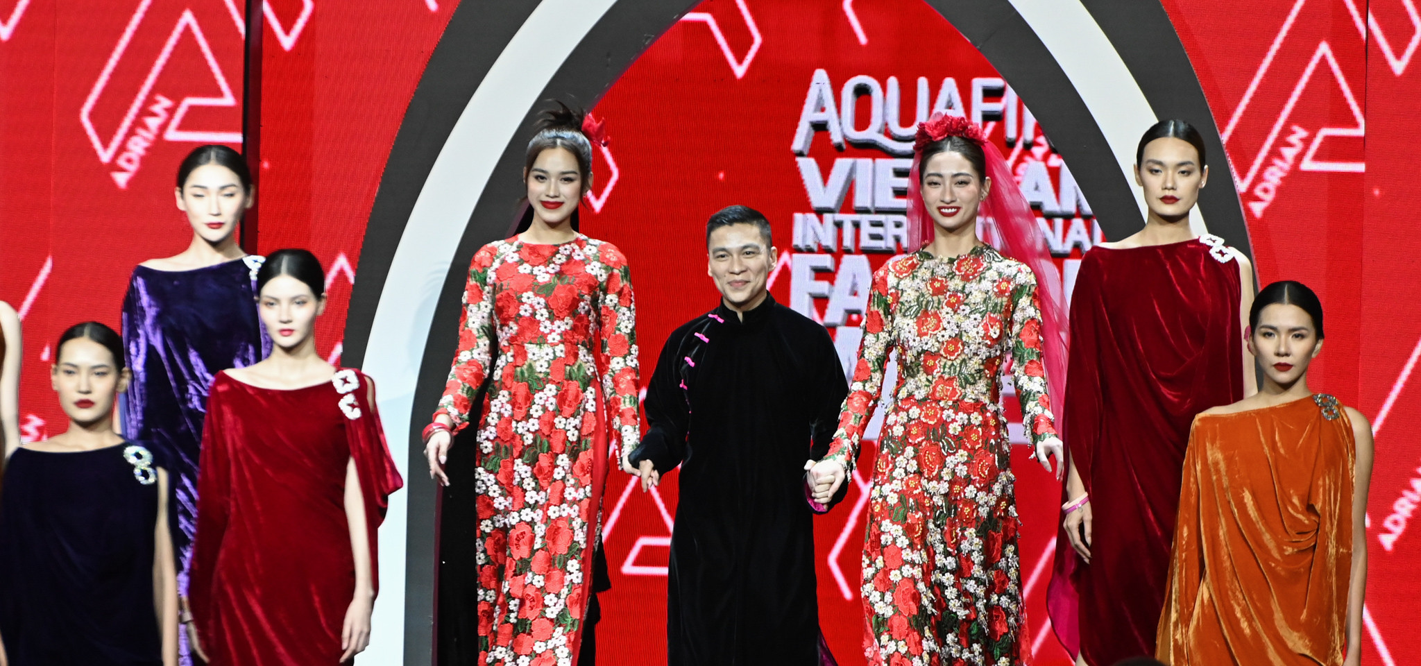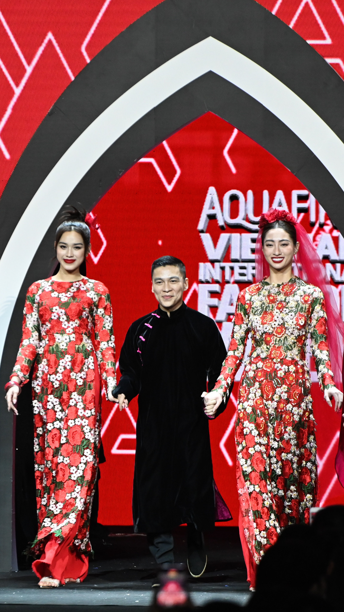 21h30, màn trình diễn kết thúc. NTK Adrian Anh Tuấn nắm tay hai nàng hậu bước ra sân khấu để cảm ơn sự có mặt và dõi theo của đông đảo khách mời.