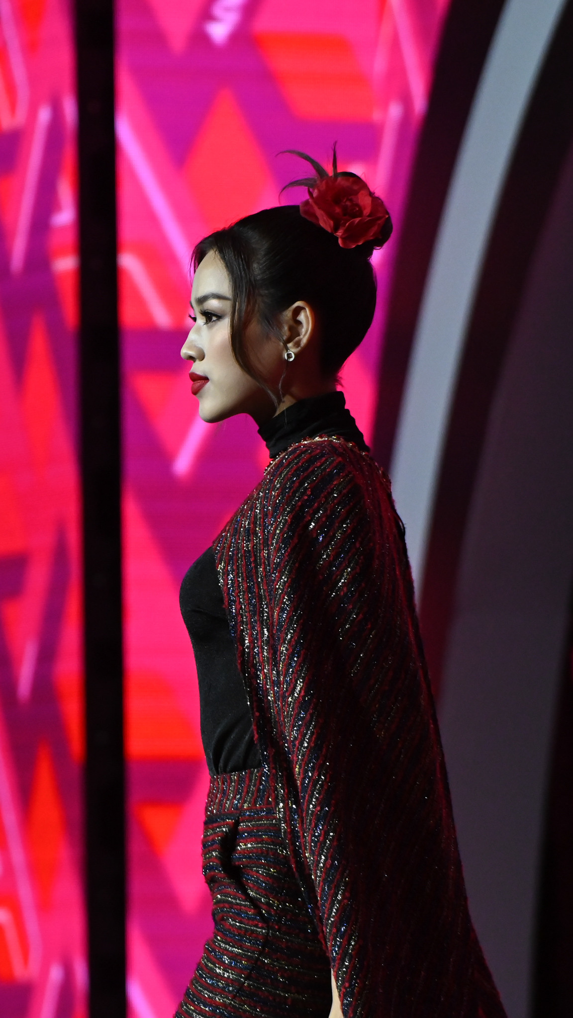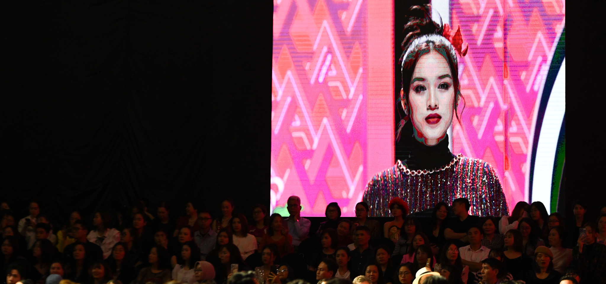 21h15, hình ảnh đầu tiên của Đỗ Thị Hà xuất hiện trên màn hình chiếu. Khách mời, khán giả đổ dồn ánh mắt về phía đương kim hoa hậu.