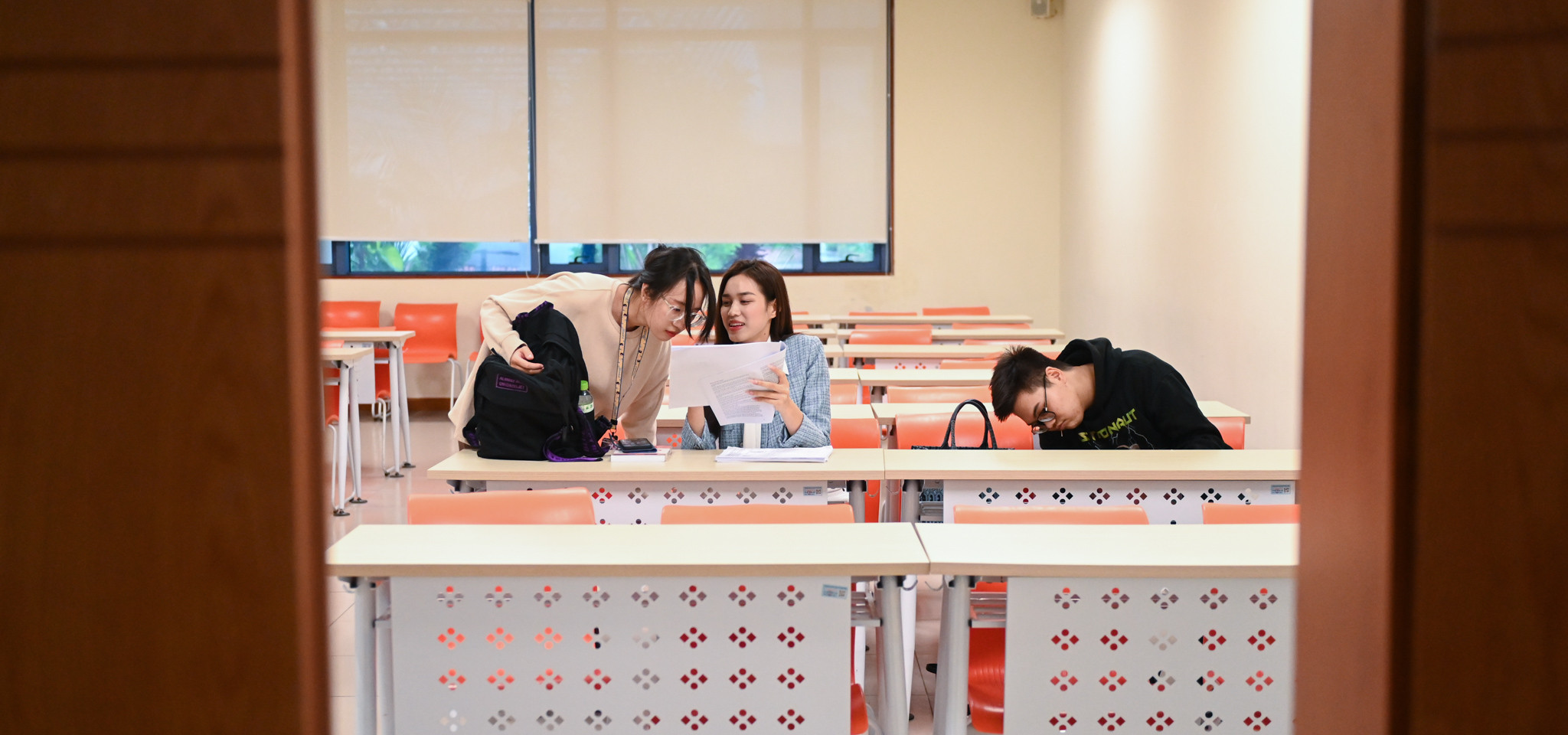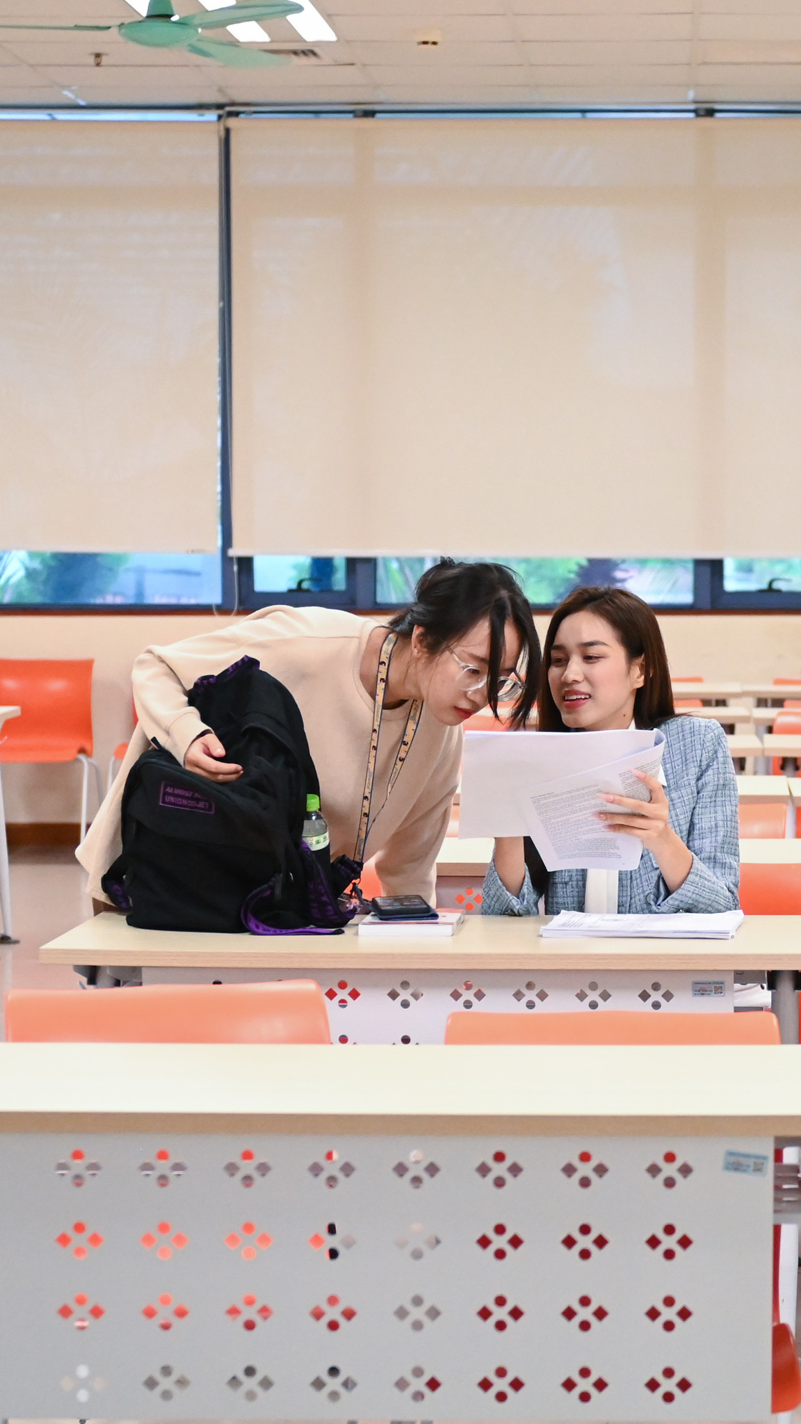 Hà còn được bạn bè gọi là "miss thân thiện" bởi tính cách dễ gần, thật thà. Hôm nay, trước khi giờ thi bắt đầu, Hoa hậu Việt Nam và cô bạn cùng lớp tranh thủ ôn bài.