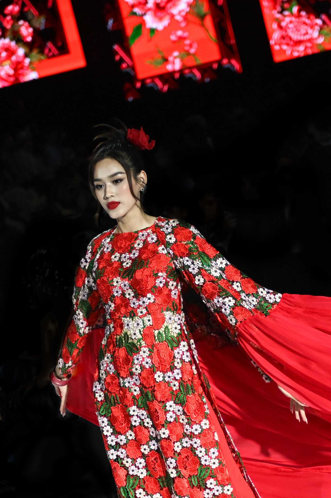 Đỗ Thị Hà tự tin với những bước đi uyển chuyển trên sàn diễn. Bộ trang phục của cô nằm trong BST "Hẹn em" của NTK Adrian Anh Tuấn với cảm hứng cổ điển và chất liệu tự nhiên, thân thiện môi trường.