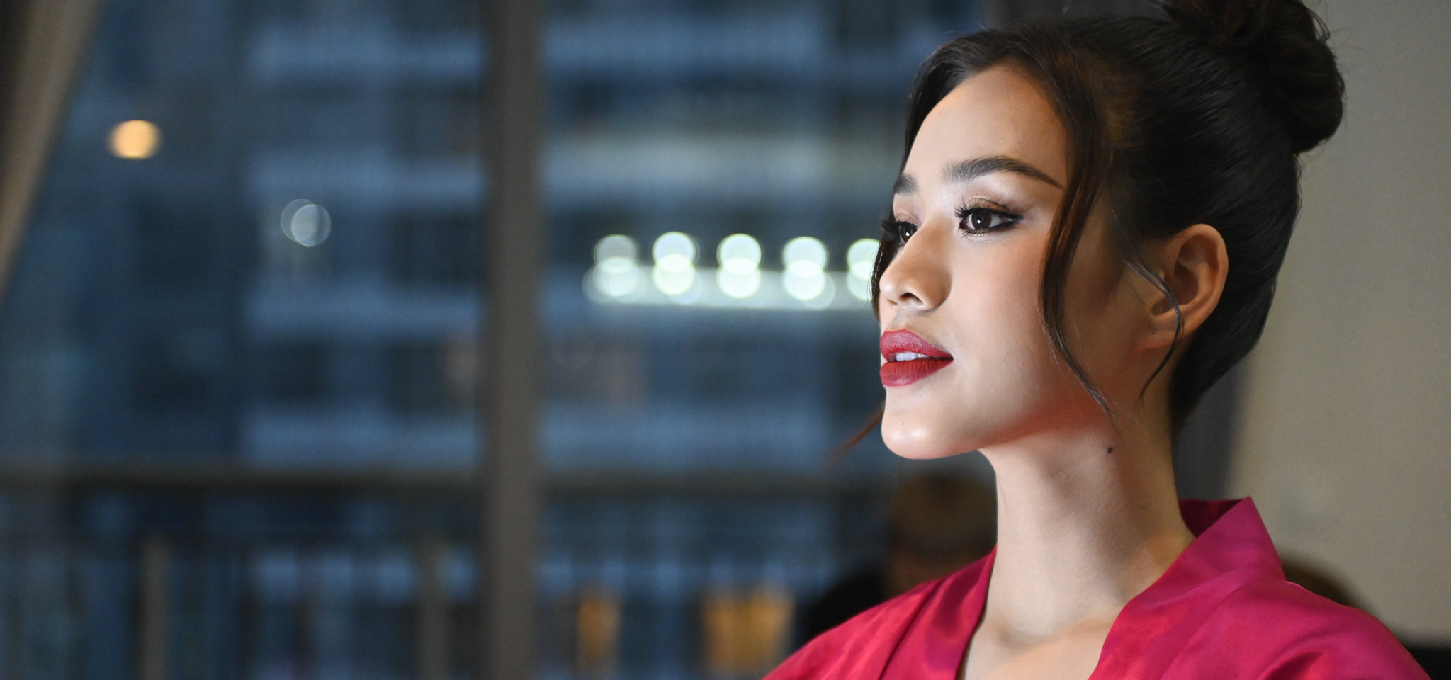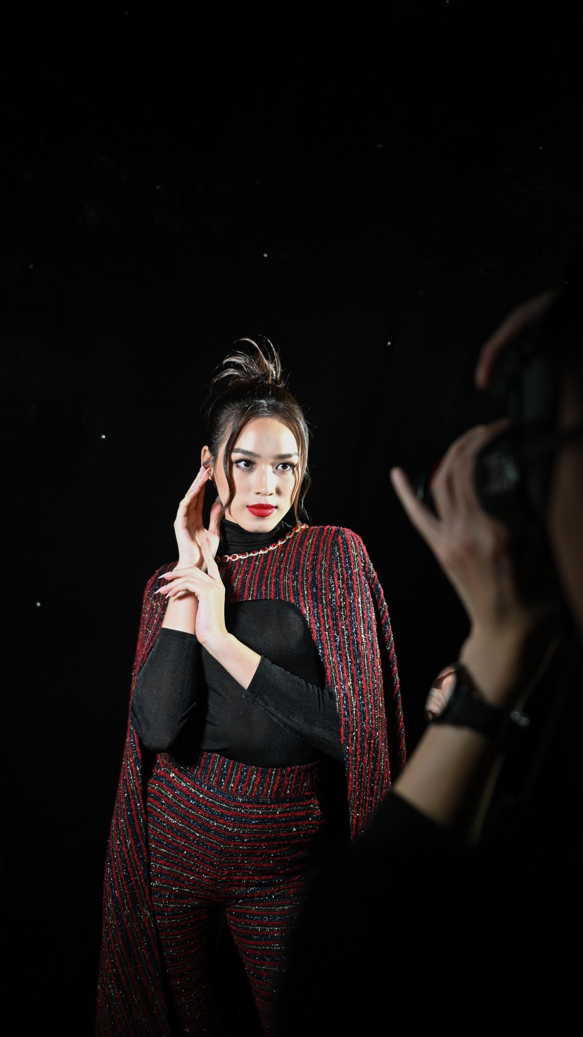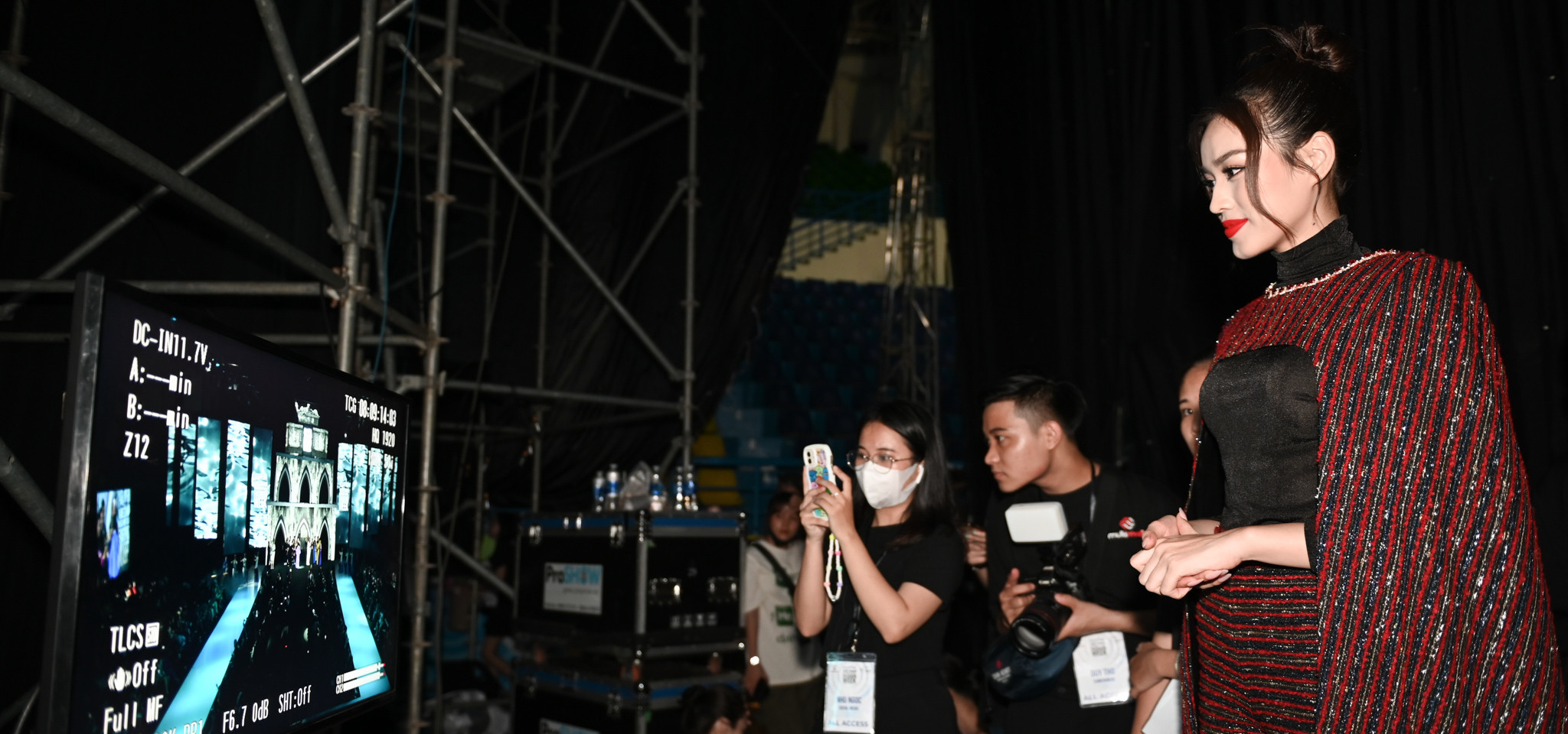 Hoa hậu dừng trước khu vực ống kính máy quay, máy ảnh, thể hiện các dáng đứng và biểu cảm từ gương mặt để làm tôn lên vẻ đẹp của bộ trang phục.