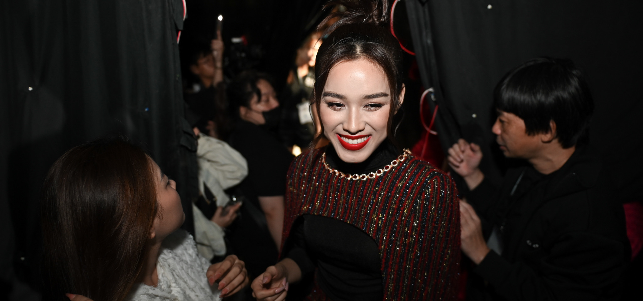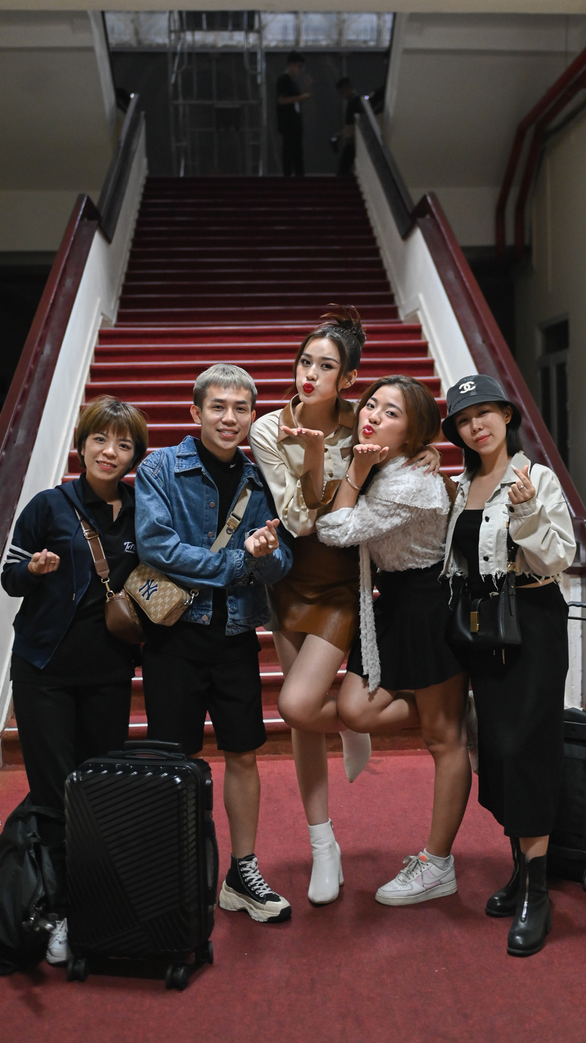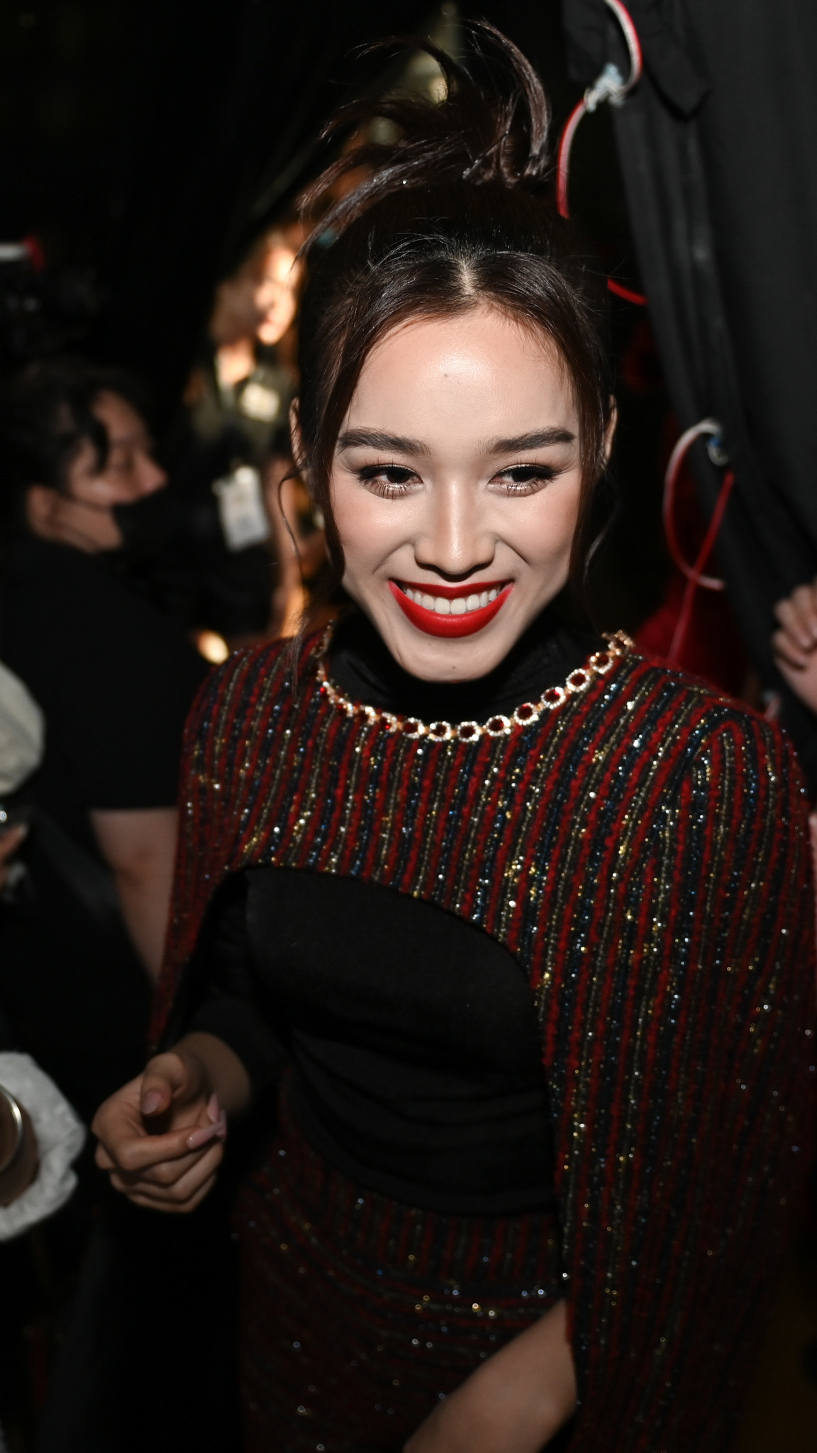 Cô nở nụ cười rạng rỡ ở hậu trường, phía cánh gà cùng mọi người rồi tiến tới cửa ra sân khấu chính.