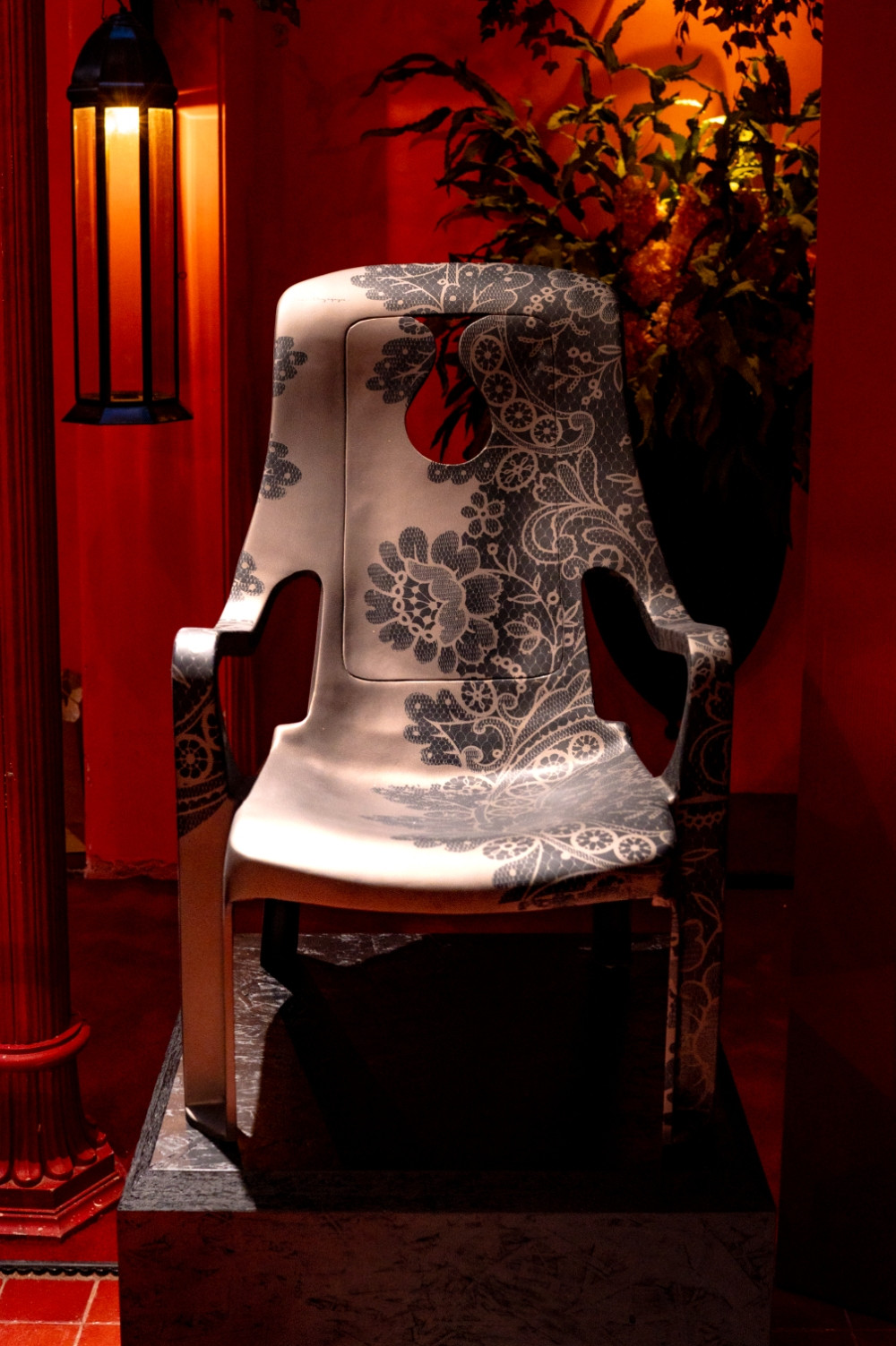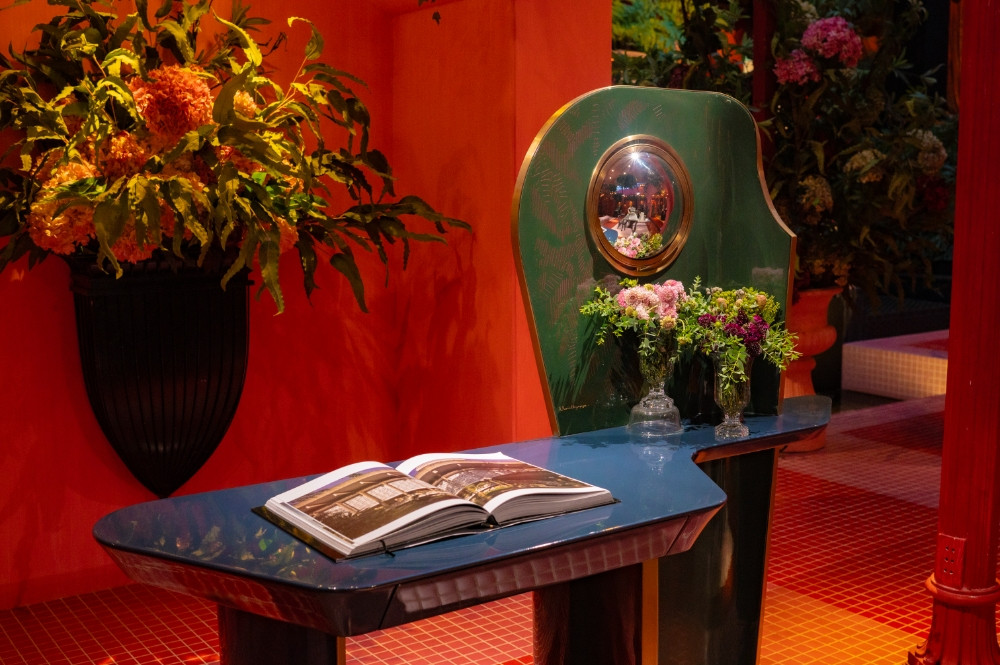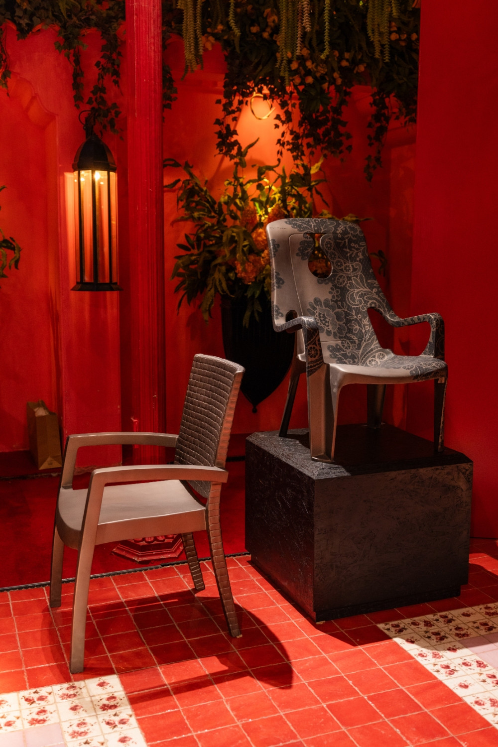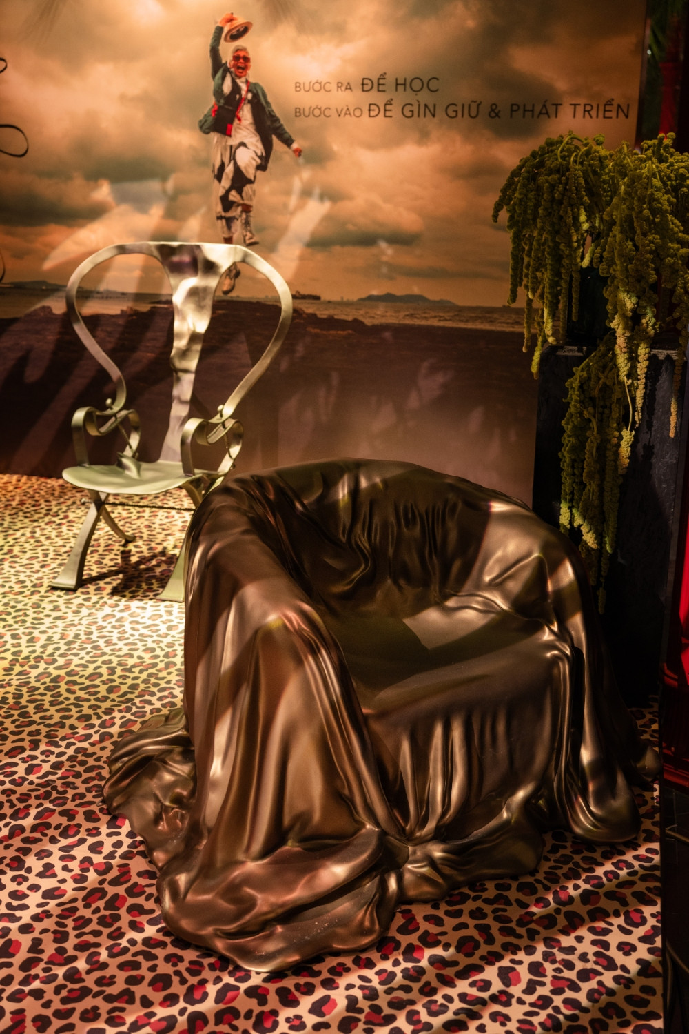 Những chiếc ghế với đường cong đầy cảm xúc trong triển lãm không chỉ là đồ nội thất mà còn là những tác phẩm điêu khắc sống động. Chiếc ghế phủ họa tiết ren truyền thống mang hơi thở cổ điển Sài Gòn xưa, trong khi những tác phẩm với đường nét hiện đại thể hiện sự vận động của thời gian và không gian. Đặc biệt, chiếc ghế bàn ăn với form dáng uốn lượn như dòng chảy sông Sài Gòn khiến nhiều khách tham quan phải dừng lại ngắm nghía. Mỗi chi tiết đều được chạm khắc tỉ mỉ, từ những họa tiết hoa văn tinh xảo đến việc lựa chọn màu sắc hài hòa với tông đỏ ấm áp không gian.