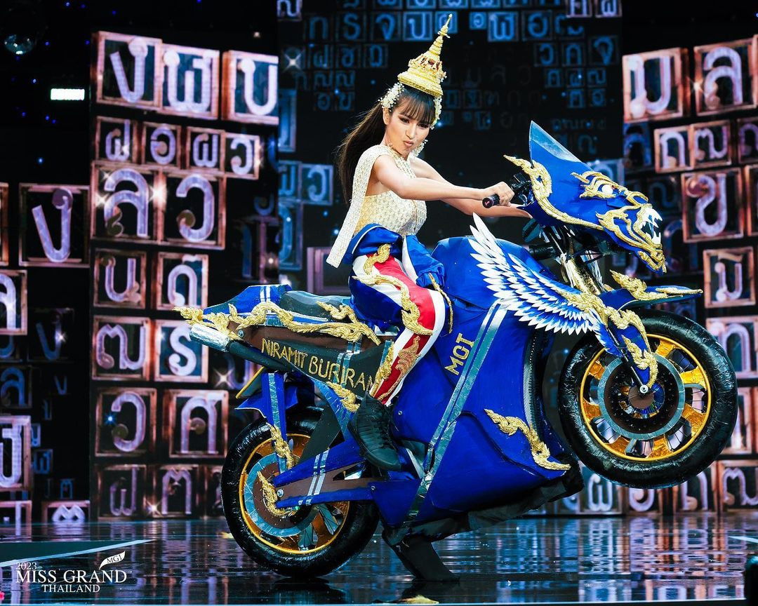 Để gây ấn tượng cho người xem, thí sinh còn đi xe máy lên sân khấu trong phần trình diễn trang phục dân tộc.