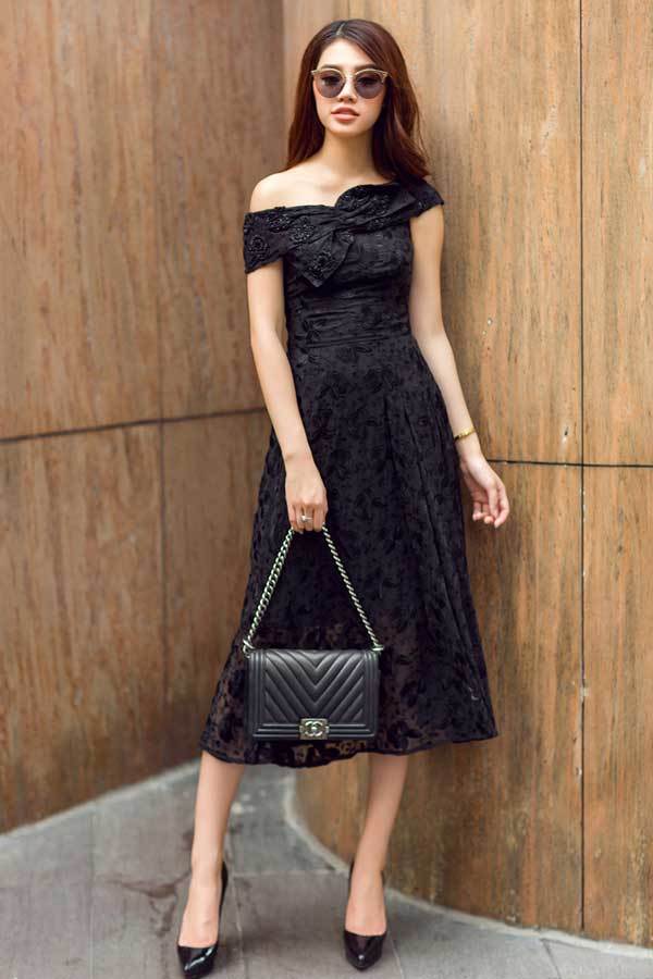 Jolie Nguyễn áp dụng công thức phối tông xuyệt tông giữa trang phục và phụ kiện khi xuống phố với sắc đen trầm mặc nhưng sang trọng, cá tính. Trang phục được tạo điểm nhấn bằng chi tiết nơ bắt chéo nơi phần ngực tạo thành cấu trúc trễ vai gợi cảm.  |