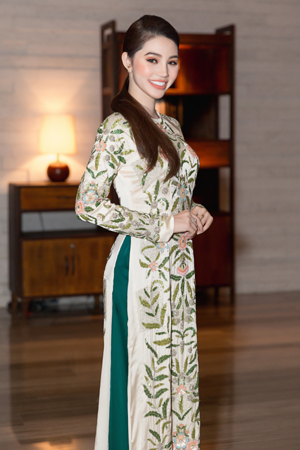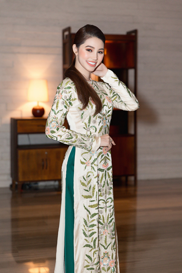 Jolie Nguyễn khoe vẻ dịu dàng và đường cong quyễn rũ một cách khéo léo qua tà áo dài truyền thống của người phụ nữ Việt Nam. |
