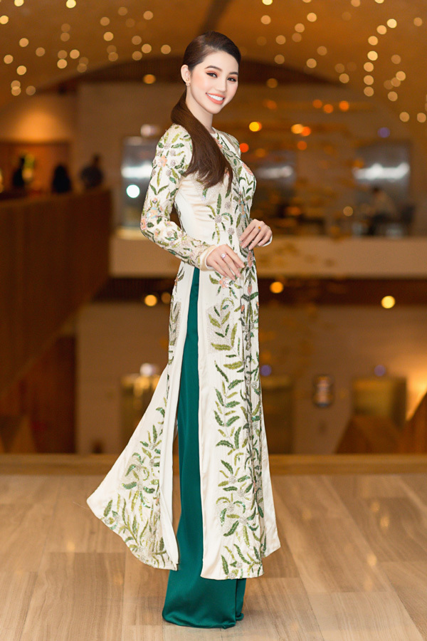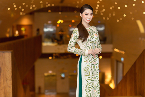 Tối 8/10, Hoa hậu Thế giới Việt Nam tại Australia - Jolie Nguyễn xuất hiện xinh đẹp khi tham gia một sự kiện thuộc khuôn khổ cuộc thi Miss Grand International 2017. Thoát khỏi vẻ gợi cảm, phong cách thời trang cá tính thường thấy, lần này cô chọn áo dài của NTK Tùng Vũ. Bộ trang phục gây ấn tượng với họa tiết thêu tinh xảo, kết hợp cùng kiểu tóc cột đơn giản và tông trang điểm nhấn vào đôi mắt đầy cuốn hút.