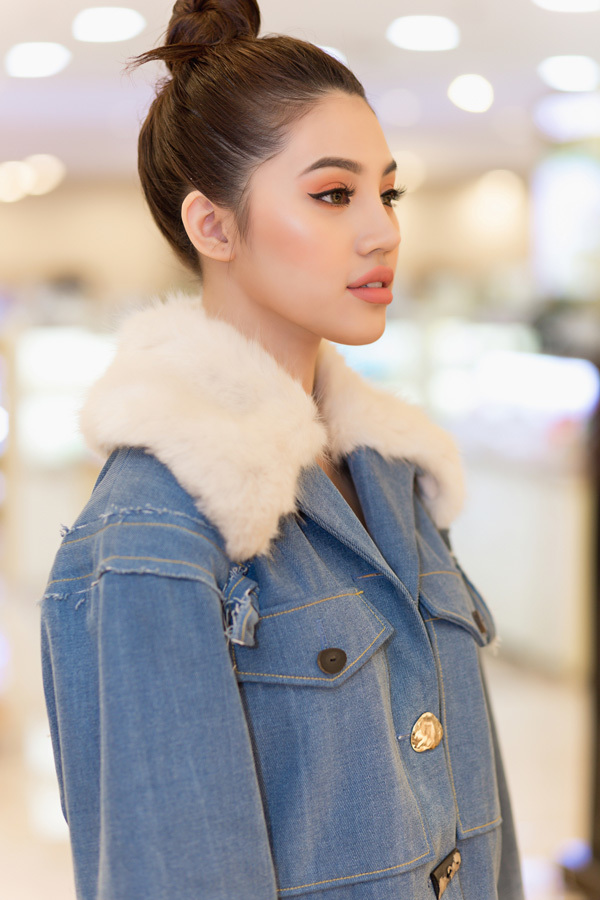 Tối 20/9, Hoa hậu Jolie Nguyễn xuất hiện xinh đẹp tại sự kiện khai trương một cửa hàng thời trang tại TP.HCM. Tại sự kiện, Hoa hậu Thế giới người Việt tại Úc khoe phong cách thời trang cá tính và nổi bật với bộ cánh denim được phối lông trắng. Để hoàn thiện vẻ ngoài, Jolie chọn mái tóc búi cao và tông trang điểm nhấn vào đôi môi căng tròn, thêm phần cuốn hút.