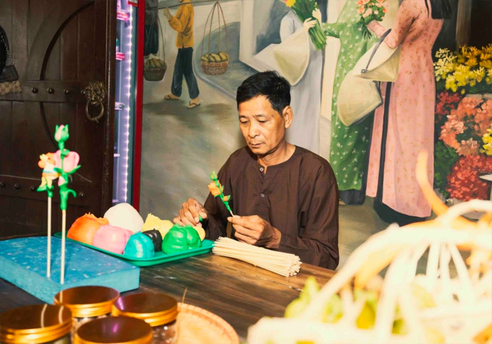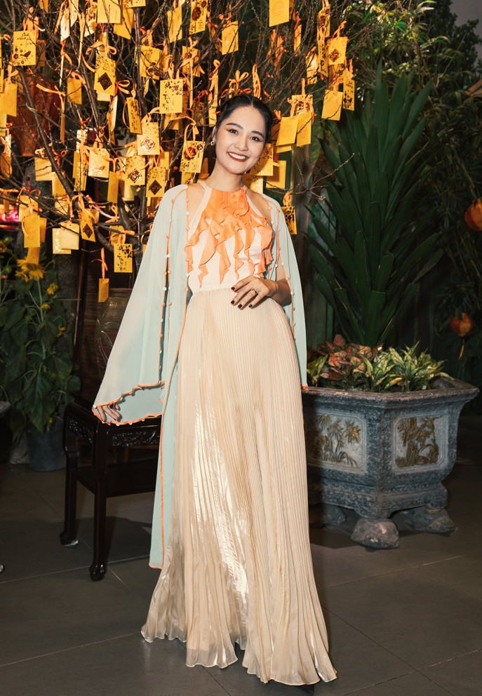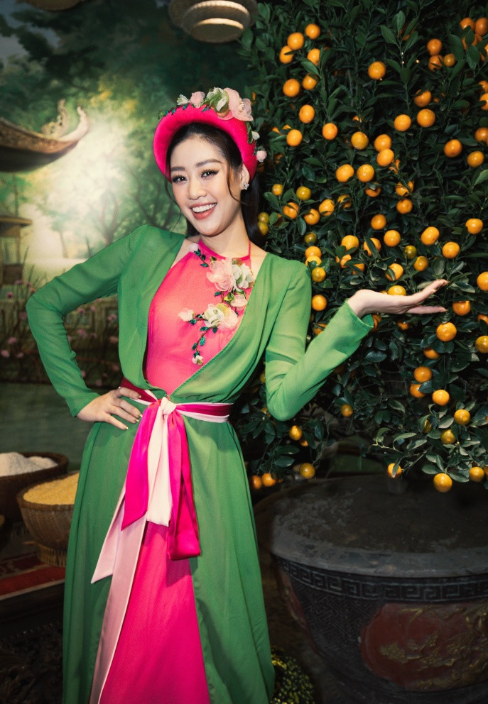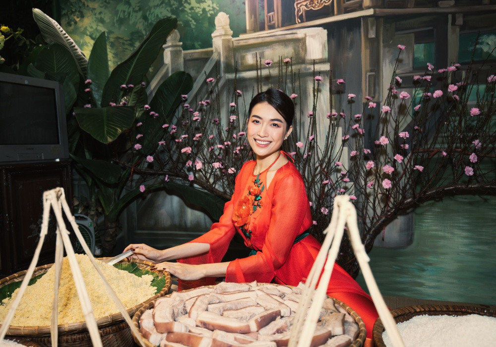 Hoa hậu Khánh Vân, Vũ Thu Phương, Lan Khuê,... cùng diện áo tứ thân tham gia các hoạt động nhảy sạp, bịt mắt đập niêu, gói bánh chưng tái hiện không khí Tết miền Bắc.
