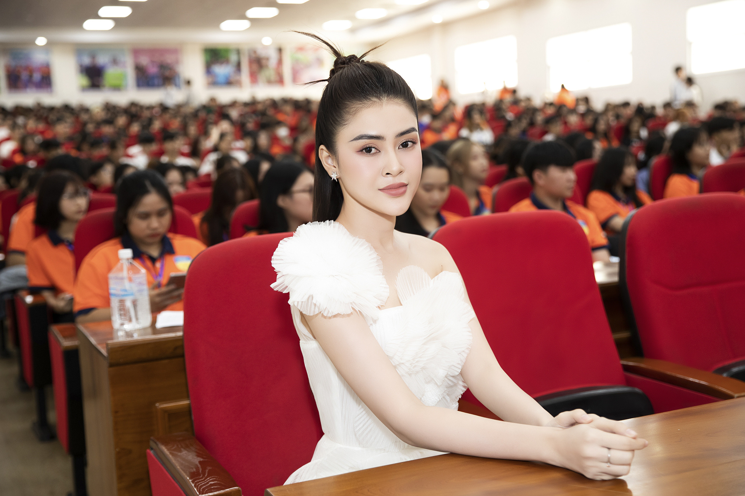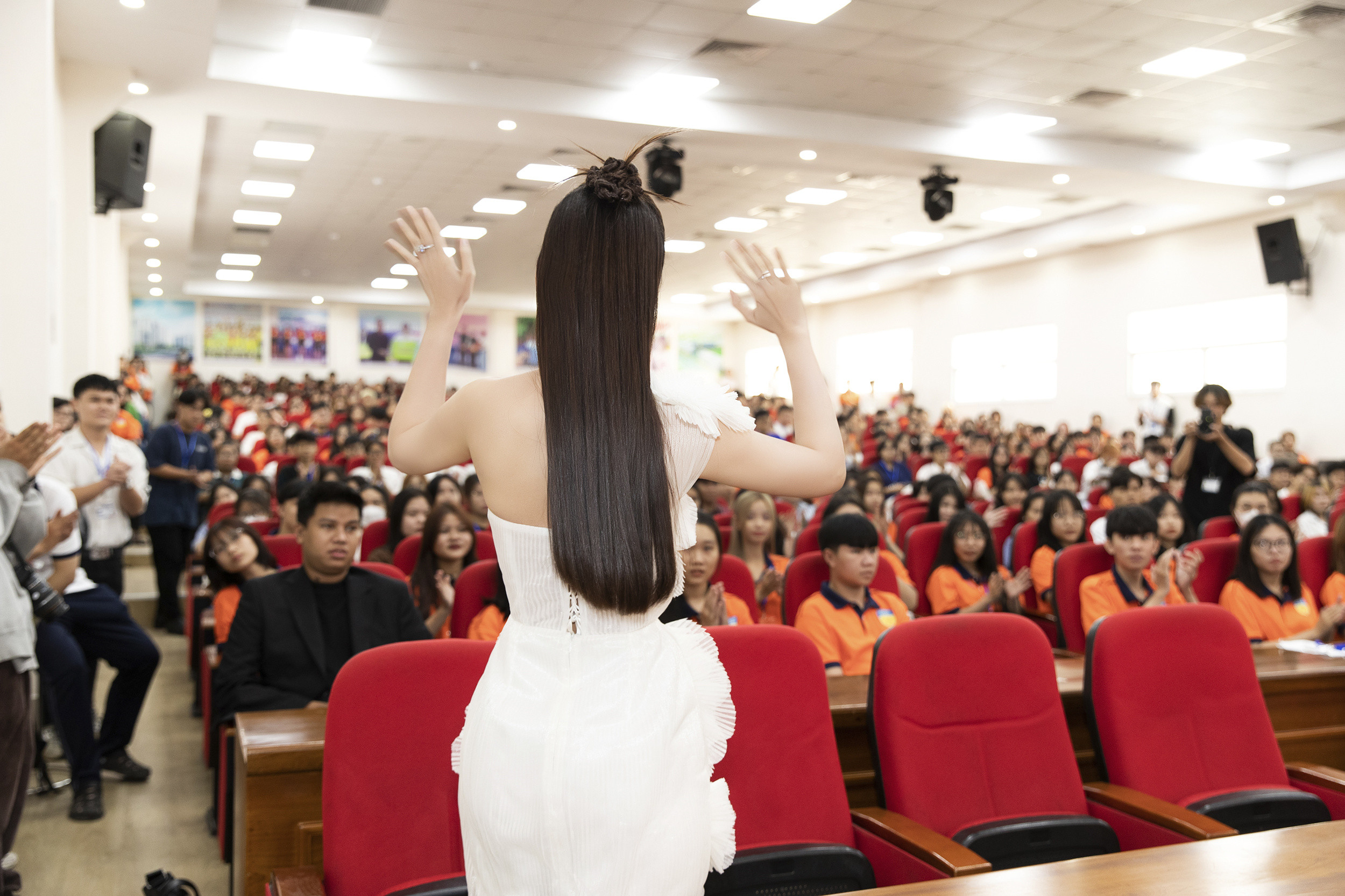 Hoa hậu Du lịch Việt Nam toàn cầu Lý Kim Thảo trở về trường Đại học Công nghệ TP.HCM để giao lưu, trò chuyện truyền cảm hứng cho tân sinh viên nơi đây.