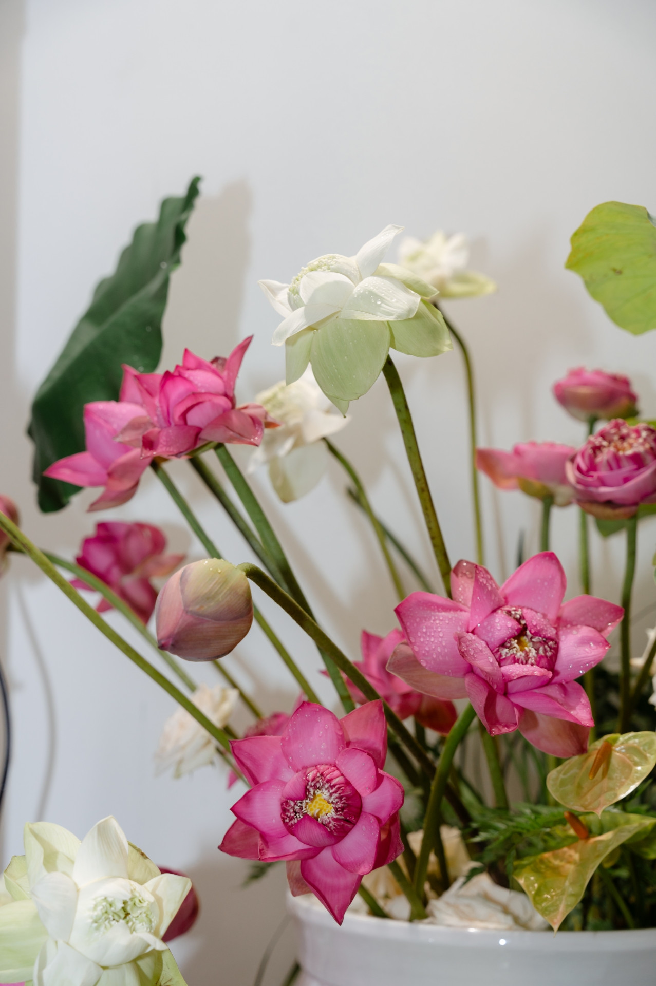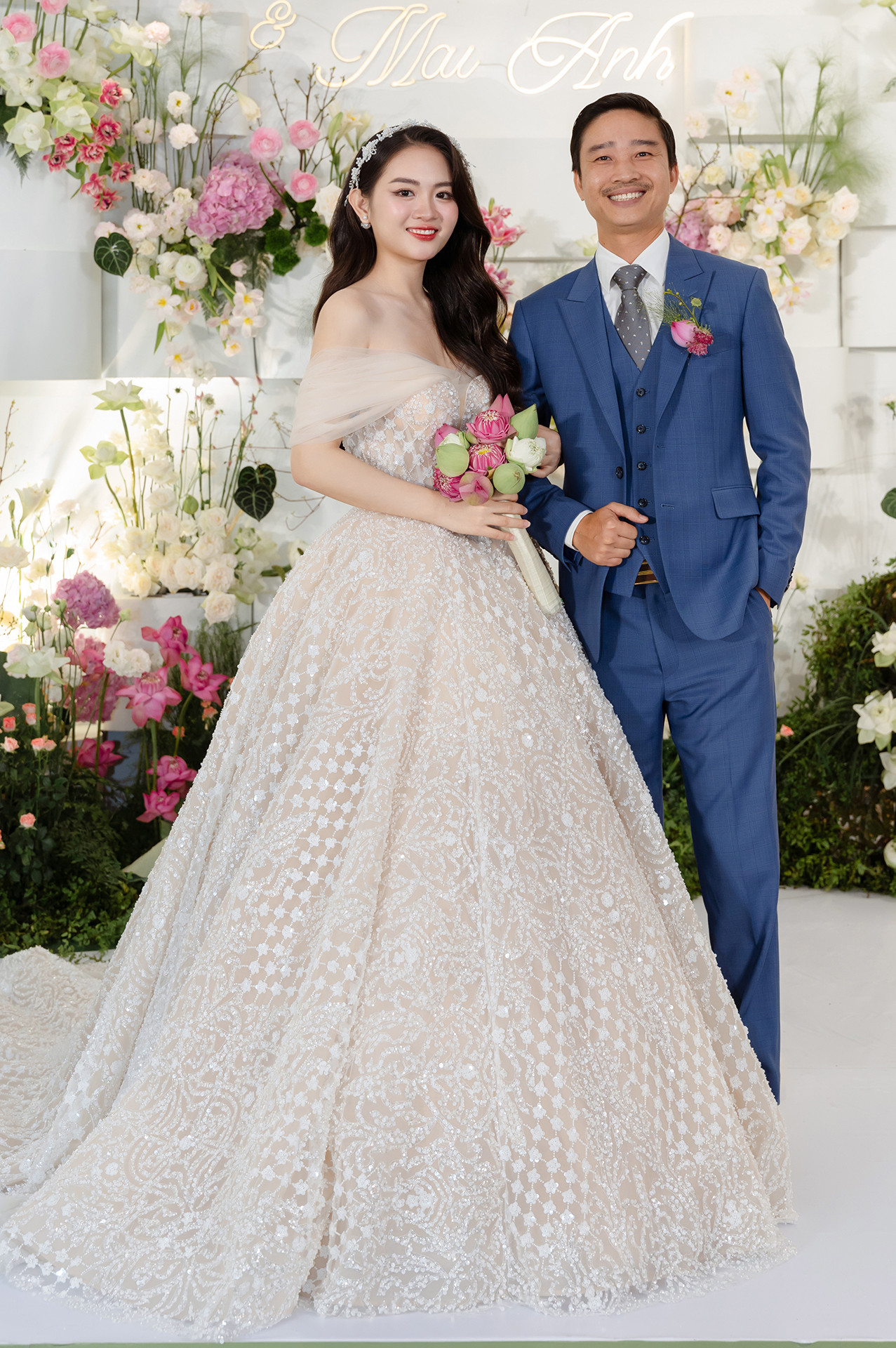 Không gian tiệc cưới trang trí chủ đạo tông màu trắng, hoa sen, hoa hồng là điểm nhấn. Cặp đôi dành nhiều thời gian lên ý tưởng về tiệc cưới, từ trang trí, đón tiếp khách đến thực đơn bữa tiệc.