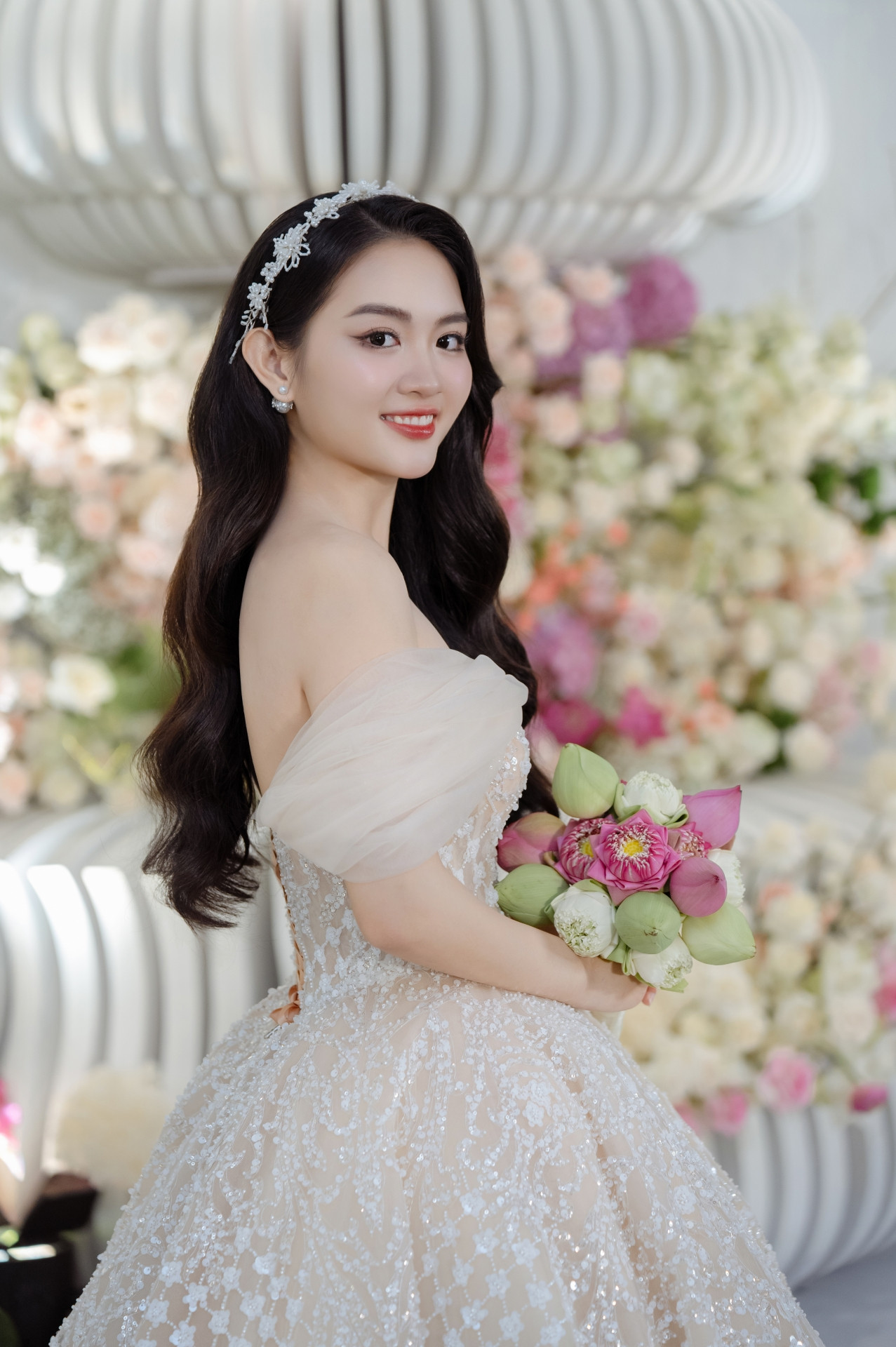 Trong ngày trọng đại, hoa hậu Mai Anh chọn 2 bộ váy cưới của thương hiệu nổi tiếng với màu trắng và beige.
