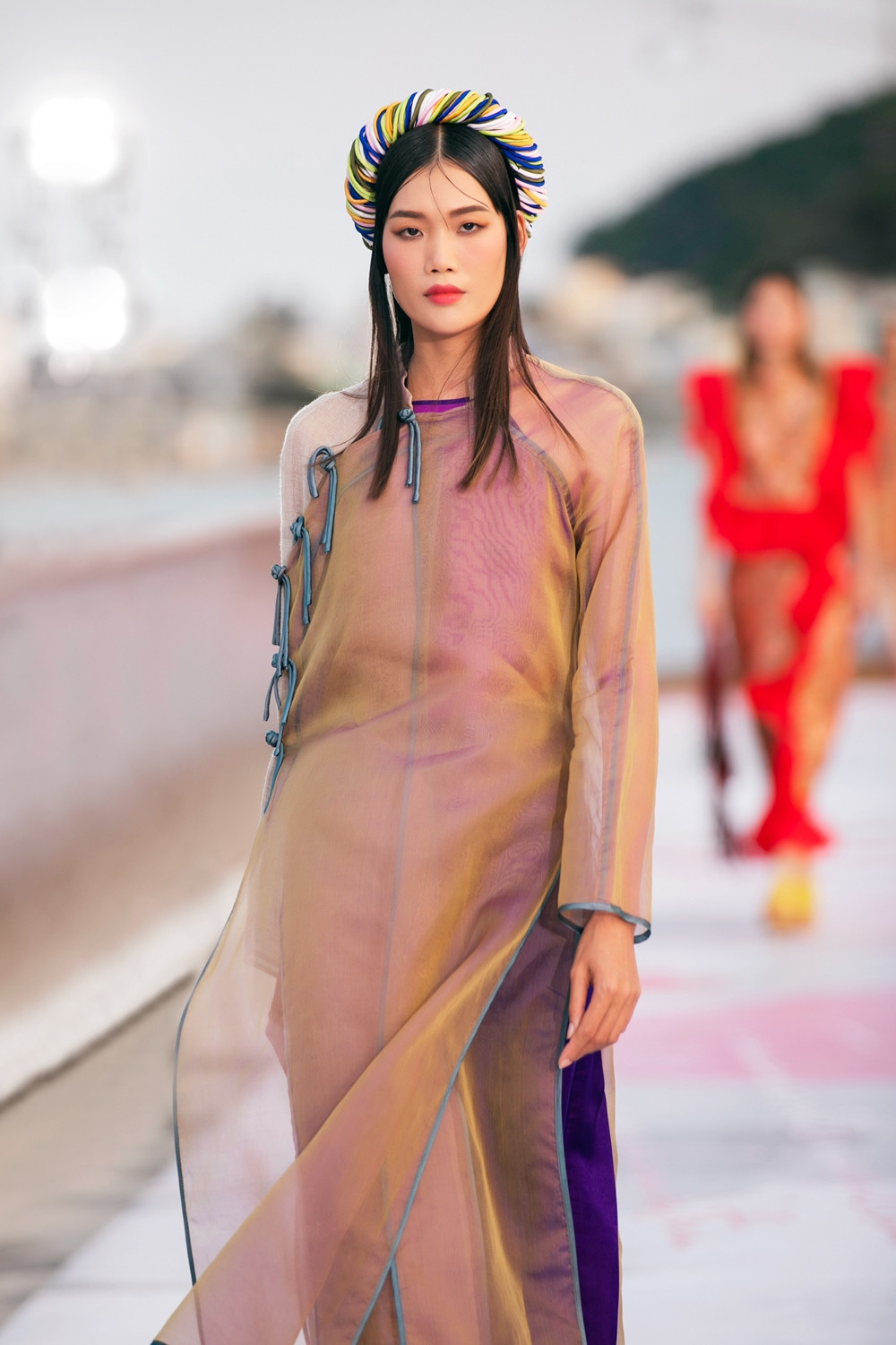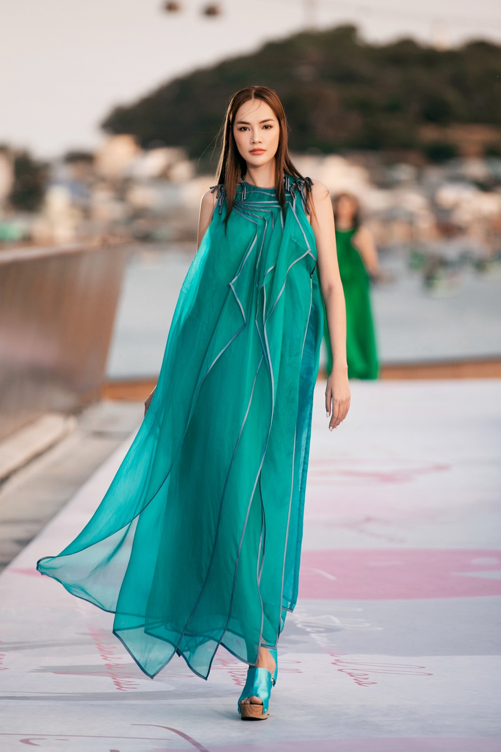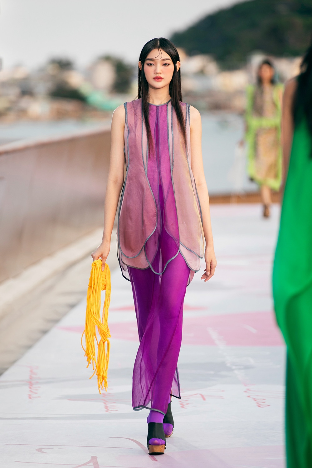 Nhà thiết kế lựa chọn sử dụng các chất liệu mềm mại như lụa, vải organza… đem đến sự bồng bềnh, nữ tính, cũng như đạt được hiệu quả tối đa khi được trình diễn giữa không gian biển trời.