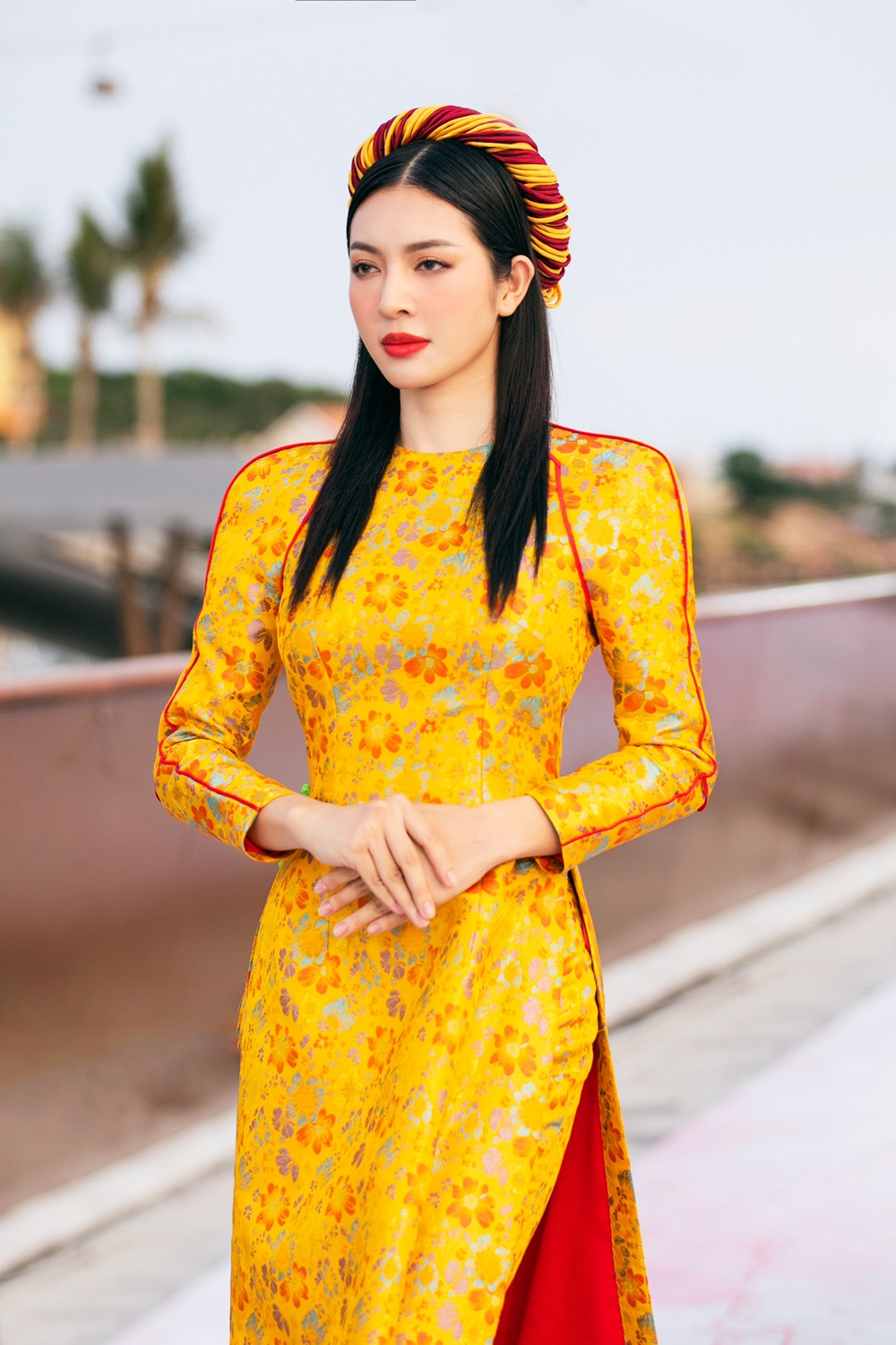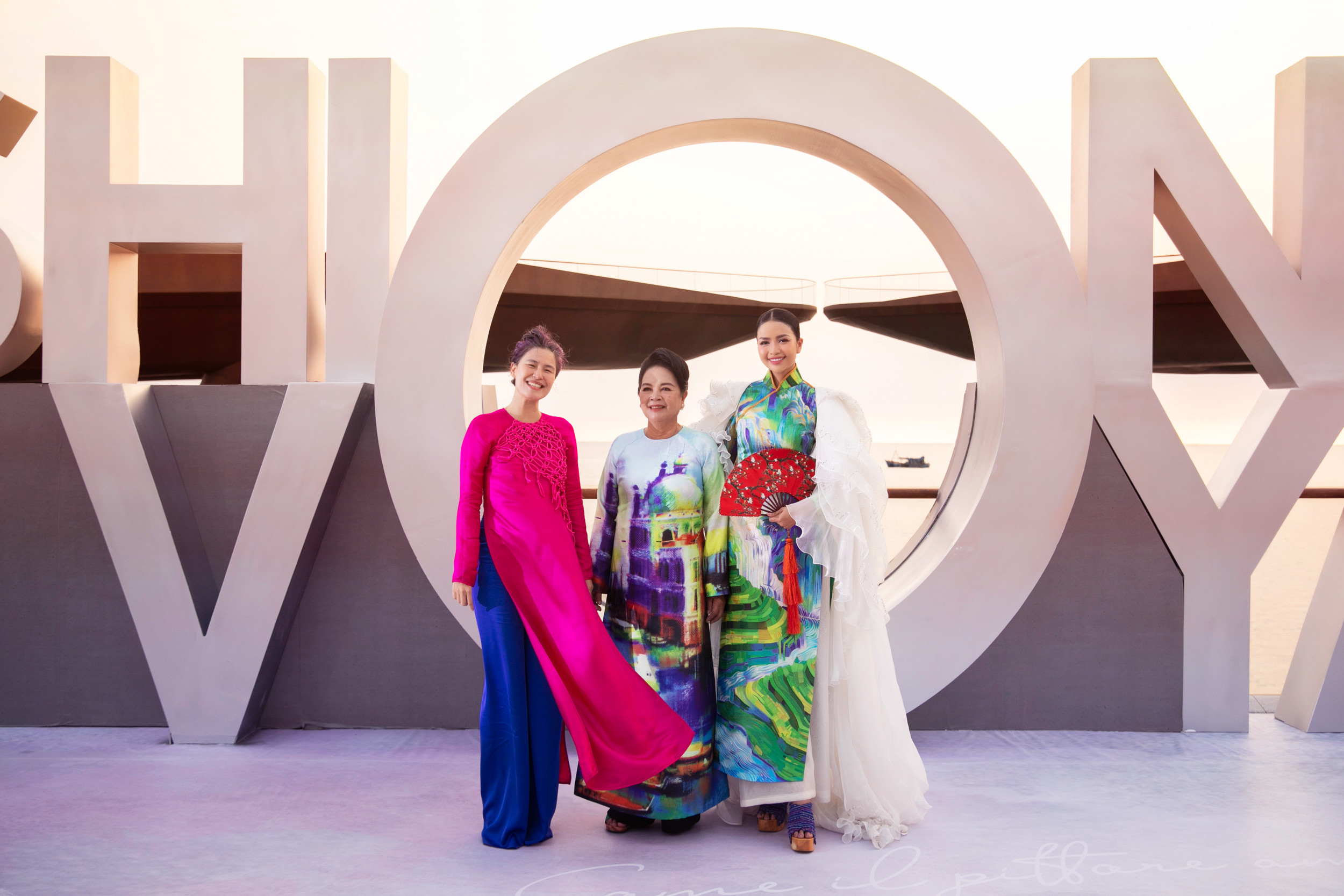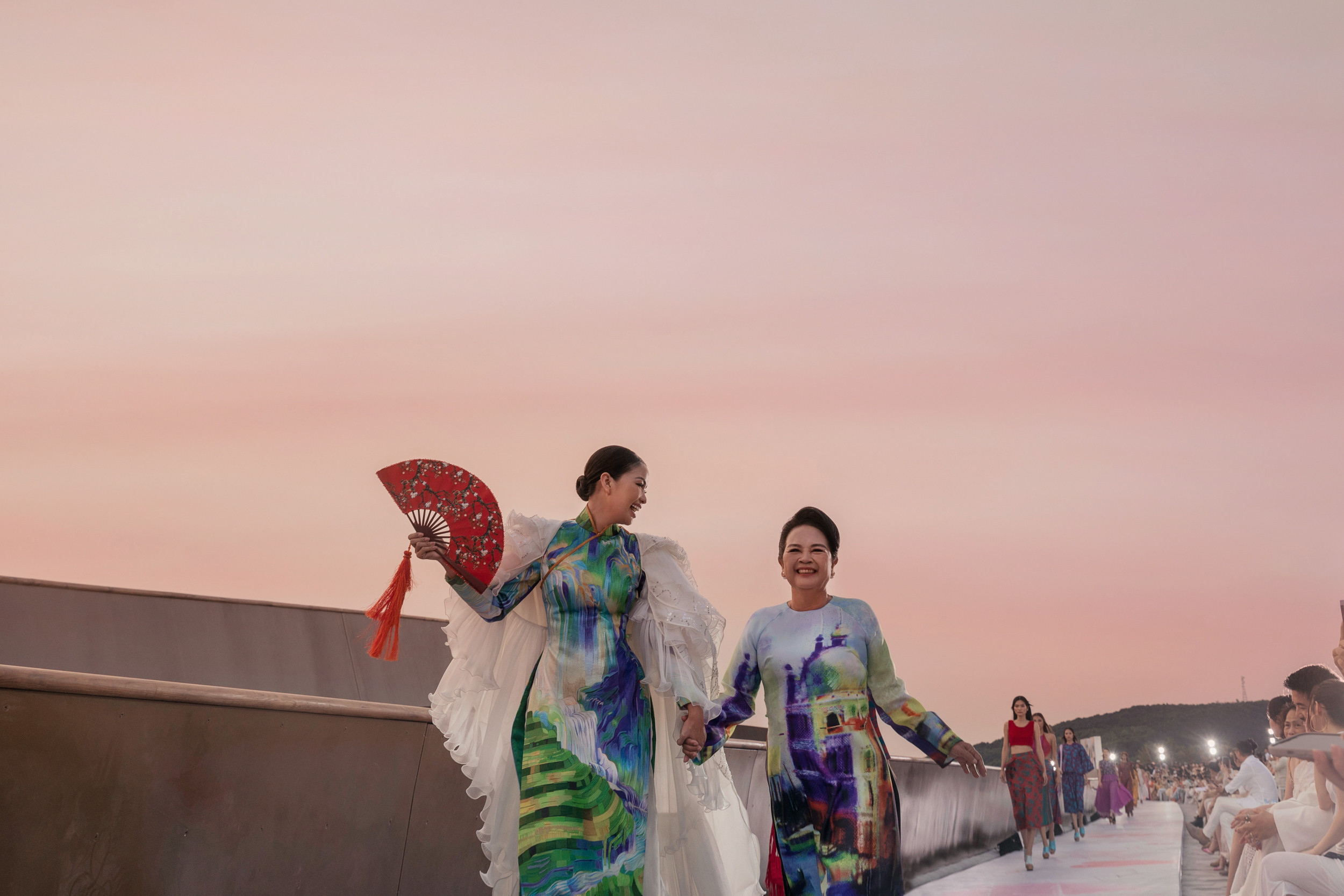 Hoa hậu Ngọc Châu lần đầu tiên trình diễn áo dài cùng mẹ trong sự kiện thời trang diễn ra ở Phú Quốc.