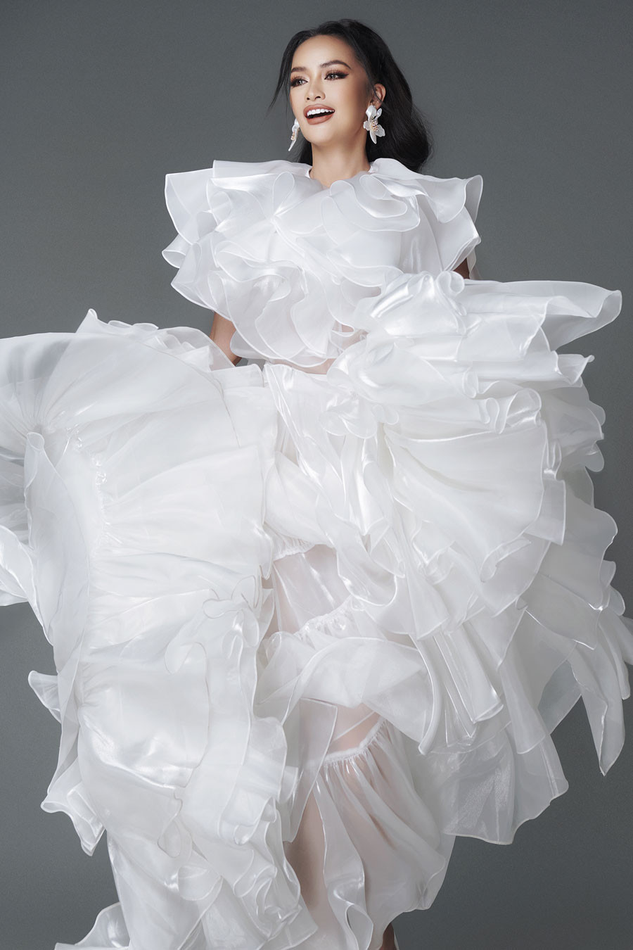 Ngọc Châu gợi cảm với váy cúp ngực, ngắn trên gối. Chiếc váy được nhấn nhá bằng chi tiết hoa 3D to bản. Ngọc Châu trang điểm mắt khói, môi lì, tóc uốn xoăn bồng bềnh tăng thêm sự cuốn hút. Chiếc váy trắng tạo điểm nhấn bởi những đường gấp nếp bất đối xứng. Phần thân váy được hạ dài xuống hơn thắt eo tạo điểm nhấn khiến trang phục của nàng hậu trở nên độc đáo.Phom áo vest cổ điển được biến tấu với chi tiết trễ vai nhưng vẫn giữ được sự thanh lịch. Chiếc áo được phối cùng chân váy xếp li, đậm chất nữ tính.Phom váy cúp ngực xoè rộng cổ điển được tô điểm bởi nhiều chi tiết hoa hồng 3D, trải đầy thân váy. Ngọc Châu thay đổi diện mạo với sắc son đỏ thẫm quyến rũ, mang hoa tai đá to bản đi kèm trang phục.Sự trẻ trung, gợi cảm của Ngọc Châu được toát lên trong thiết kế phối giữa áo xuyên thấu với chân váy có chi tiết hoa 3D to bản. Áo thực hiện bằng voan tơ mỏng, là một trong những chất liệu gây khó khăn trong việc tạo phom, cắt may chuẩn xác. Trang phục mềm mại, càng tôn lên vẻ đẹp nữ tính, thanh lịch của Ngọc Châu. Hoa hậu Hoàn vũ Việt Nam 2022 chọn hoa tai hoạ tiết hoa to bản phối cùng.
