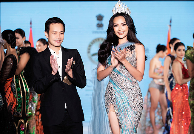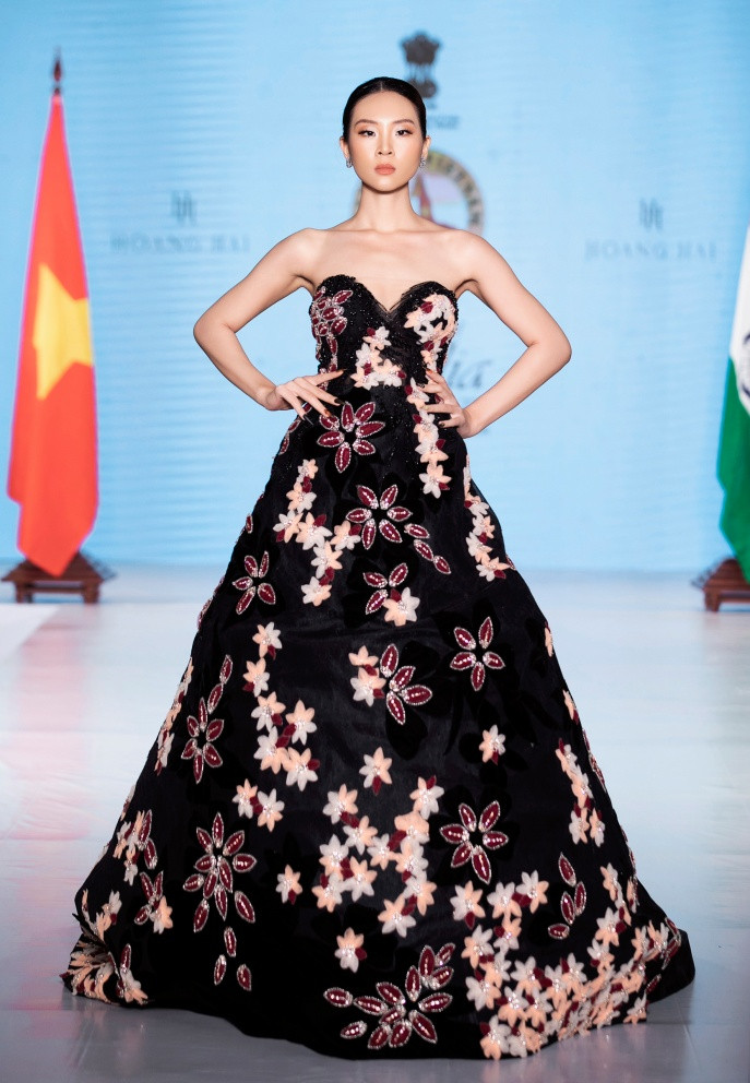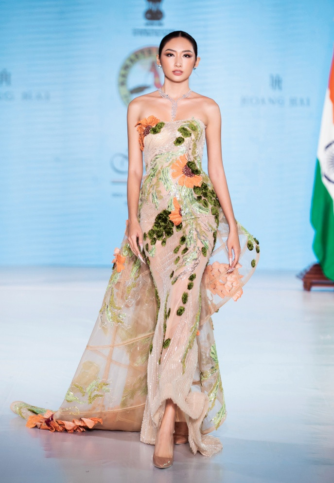 Hoa hậu Hoàn vũ Việt Nam 2022 đảm nhận vai trò vedette cho bộ sưu tập của NTK Hoàng Hải. Cô diện chiếc váy cắt xẻ cao với chi tiết đính đá, voan lụa mềm mại tạo điểm nhấn.