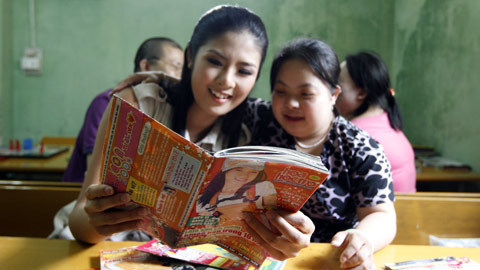 Cùng các em học sinh lớp phục hồi chức năng sinh hoạt đọc báo, kể chuyện