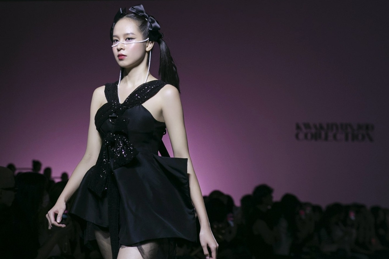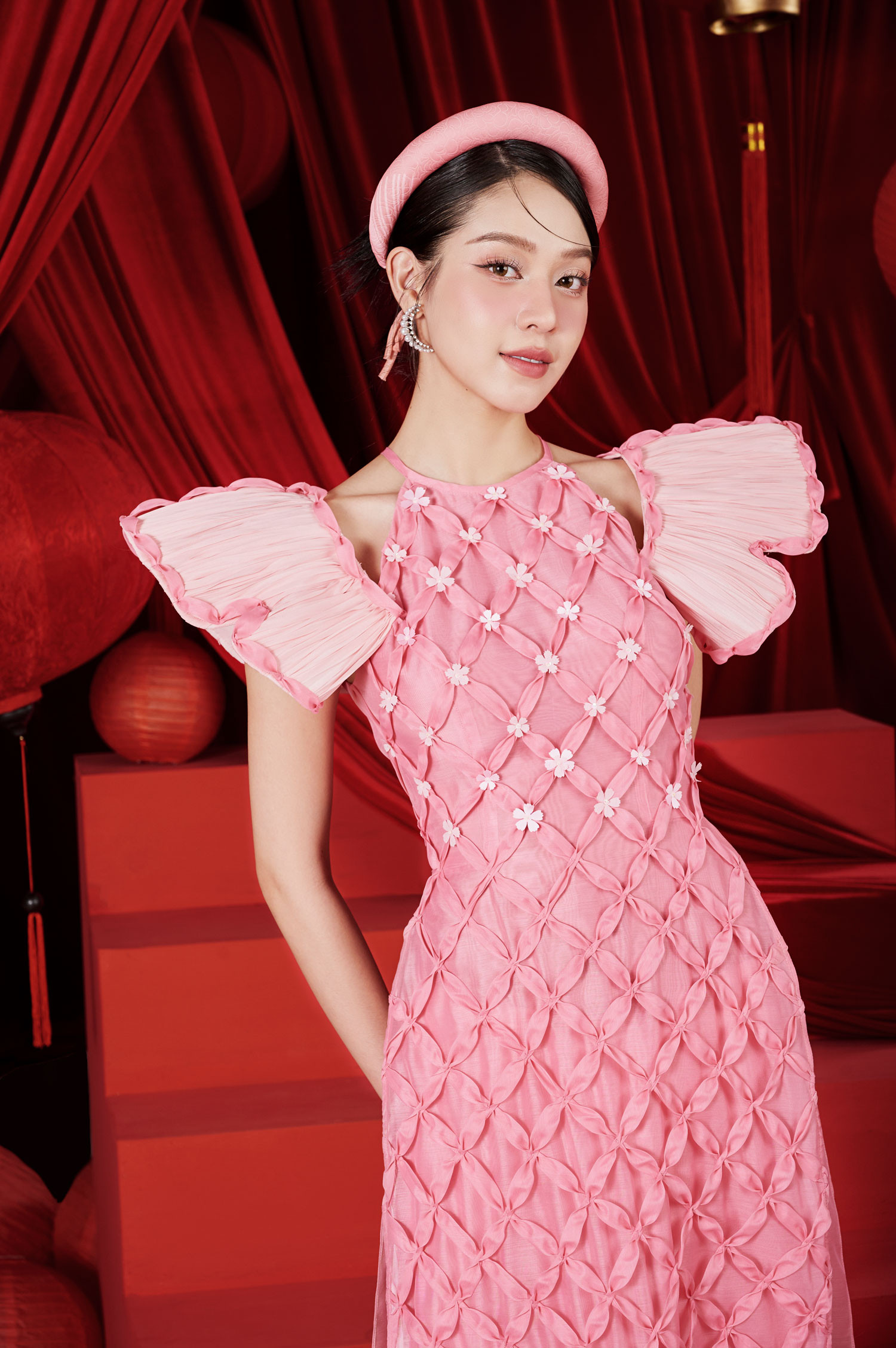 Trên nền những phom dáng hiện đại như tay bồng, vai đắp xuyên thấu, tay hến hay đính kết nơ... Lê Ngọc Lâm sử dụng kỹ thuật sắp xếp dàn đều, đính kết 3D các chi tiết như cánh hoa, cánh bướm, hình đồng xu hay họa tiết tranh Đông Hồ, nhằm giúp thiên nhiên, vẻ đẹp ngày Tết được hiện lên đầy thơ mộng.
