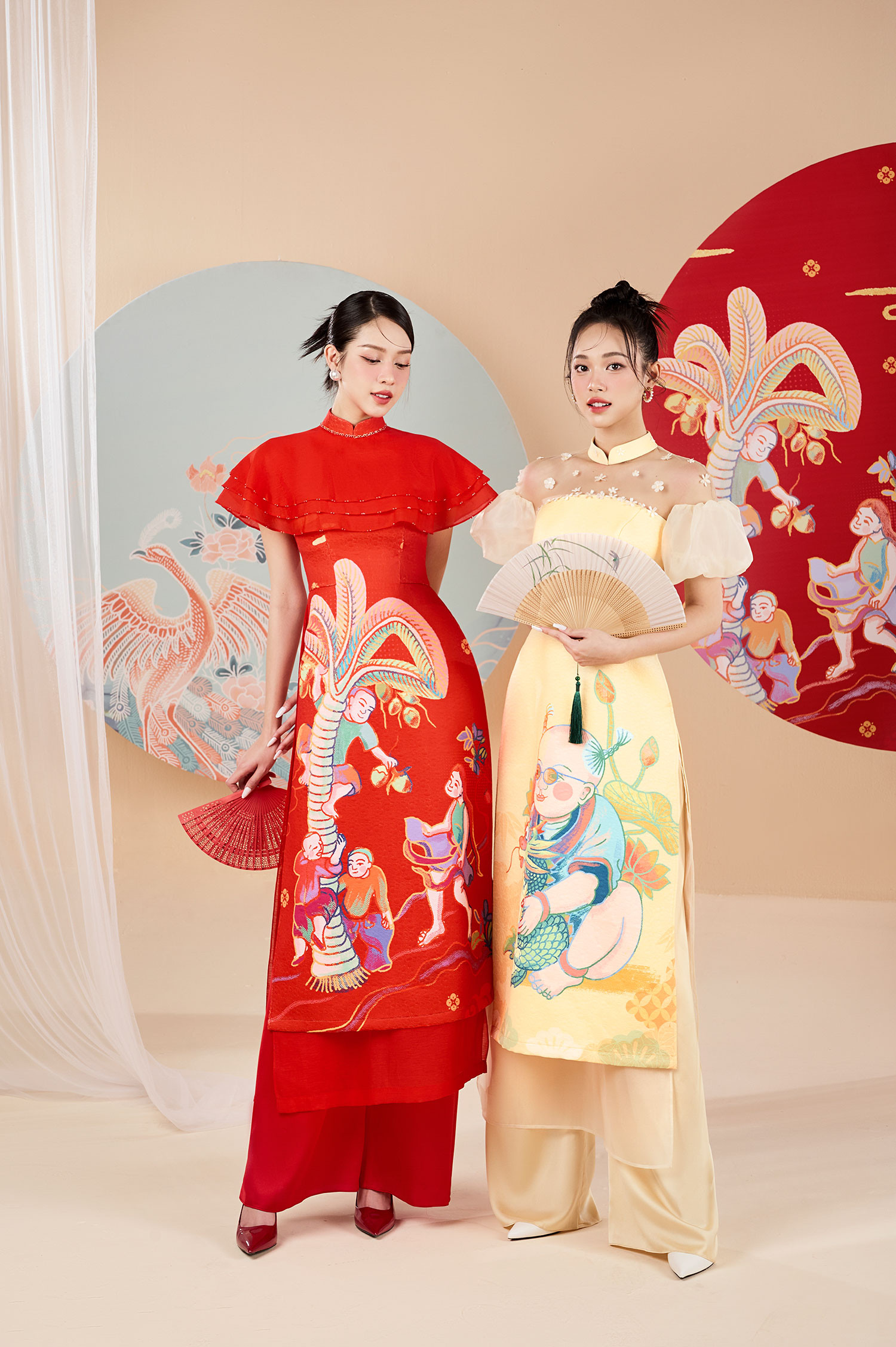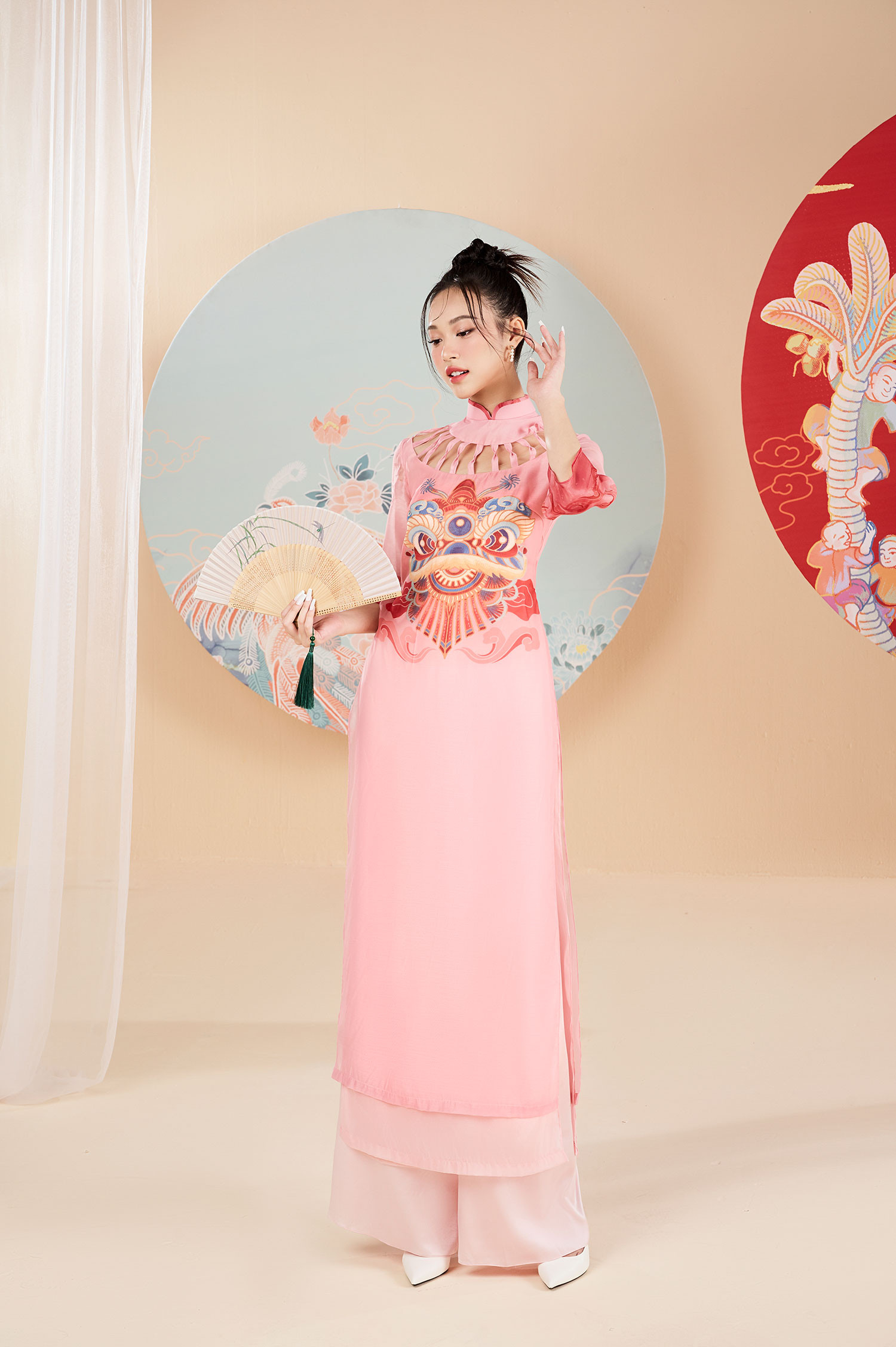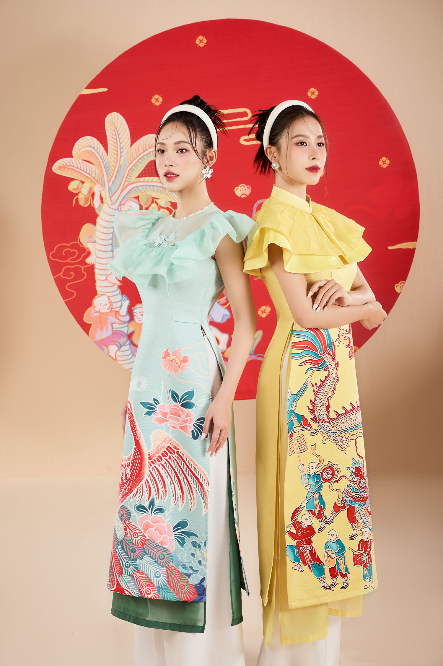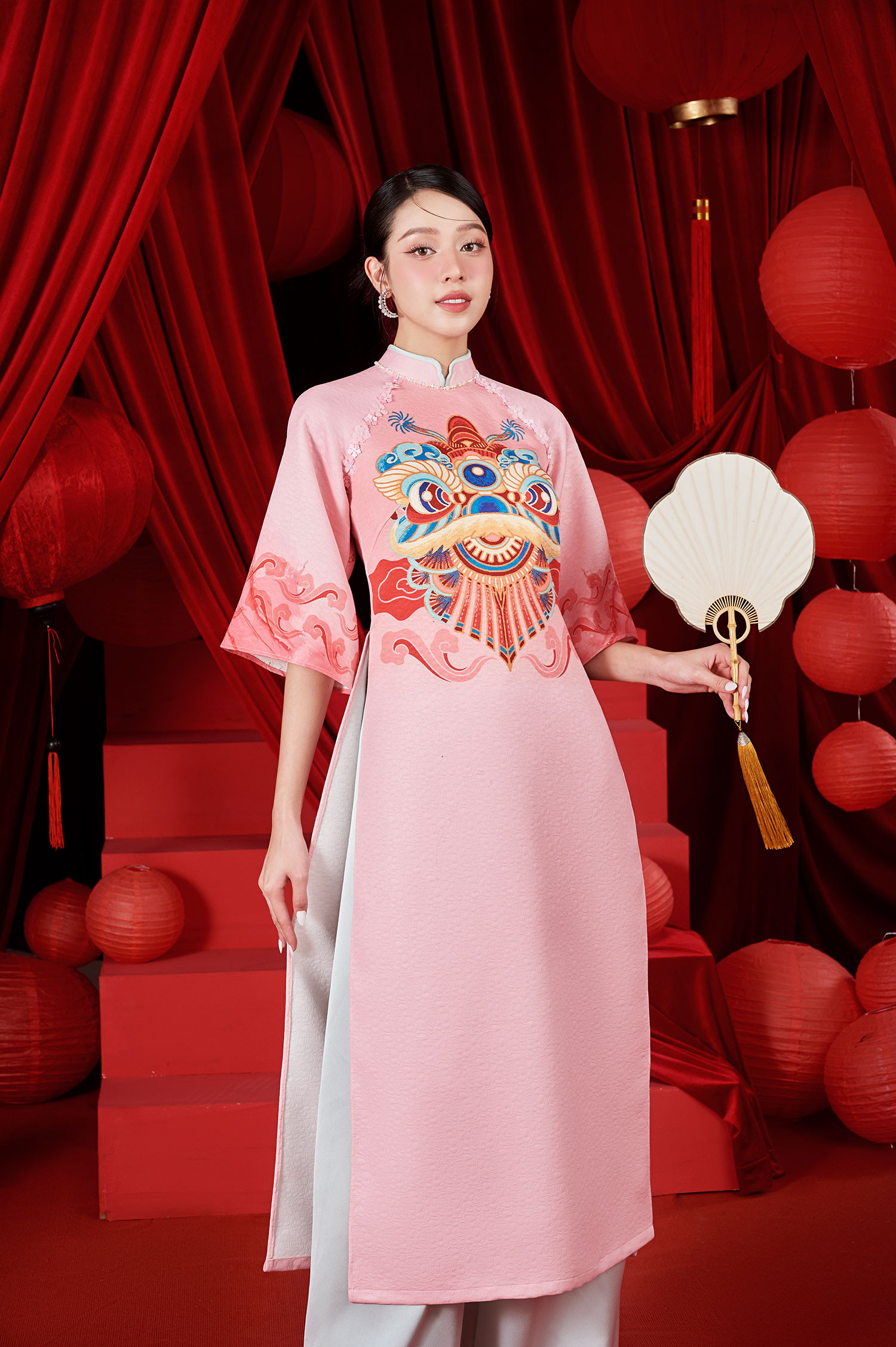 Với bộ ảnh dành cho top 3 Hoa hậu Việt Nam 2022, NTK Lê Ngọc Lâm đưa những hình ảnh cổ truyền đặc trưng ngày Tết lên tà áo dài, tạo nên những bức họa sinh động trên trang phục mang hàm nghĩa về sự sung túc, ấm no. Anh sử dụng nhiều họa tiết chim muông, rồng phượng, hoa sen hoa đào... làm chủ đạo cho bộ sưu tập.