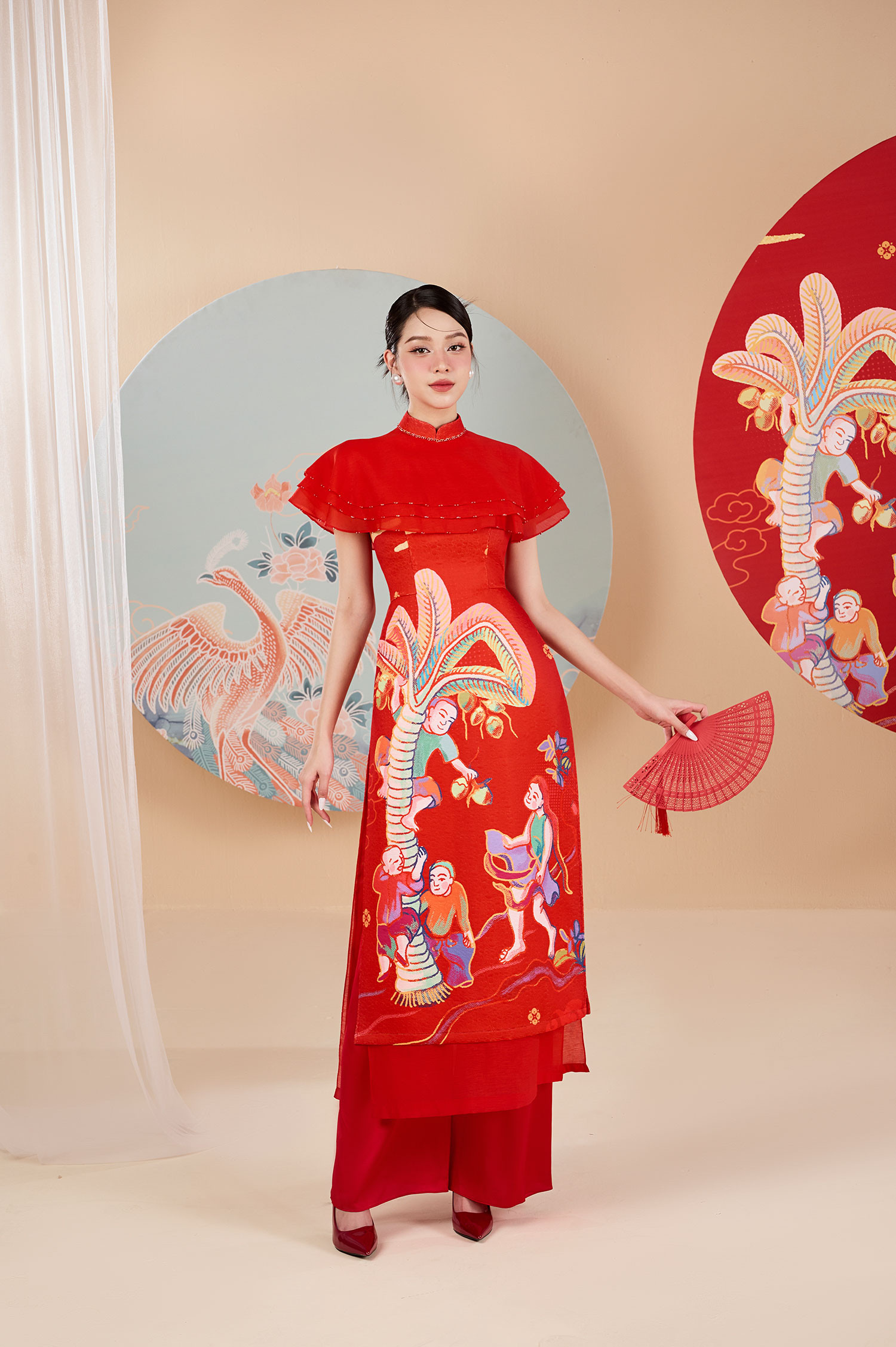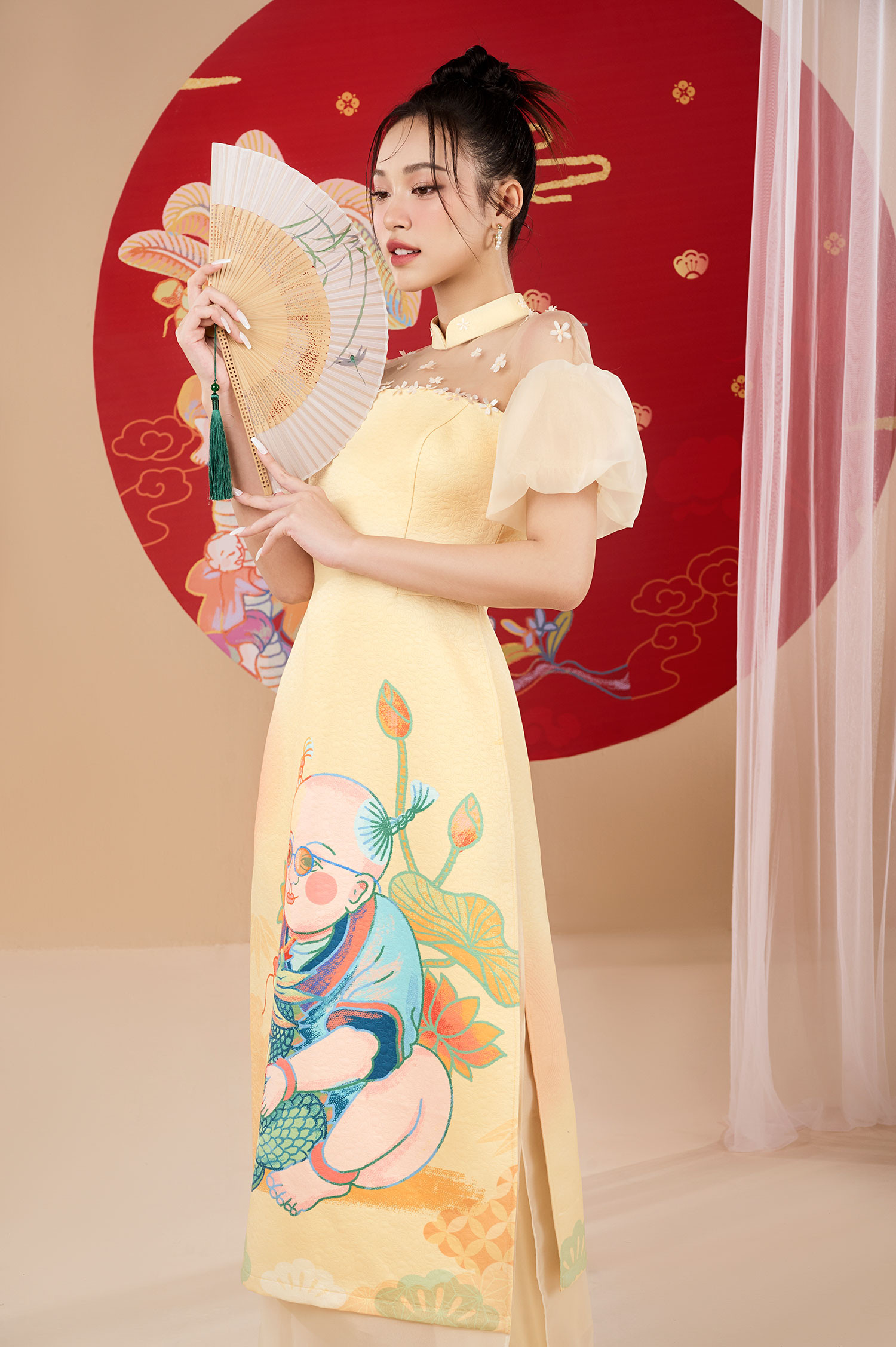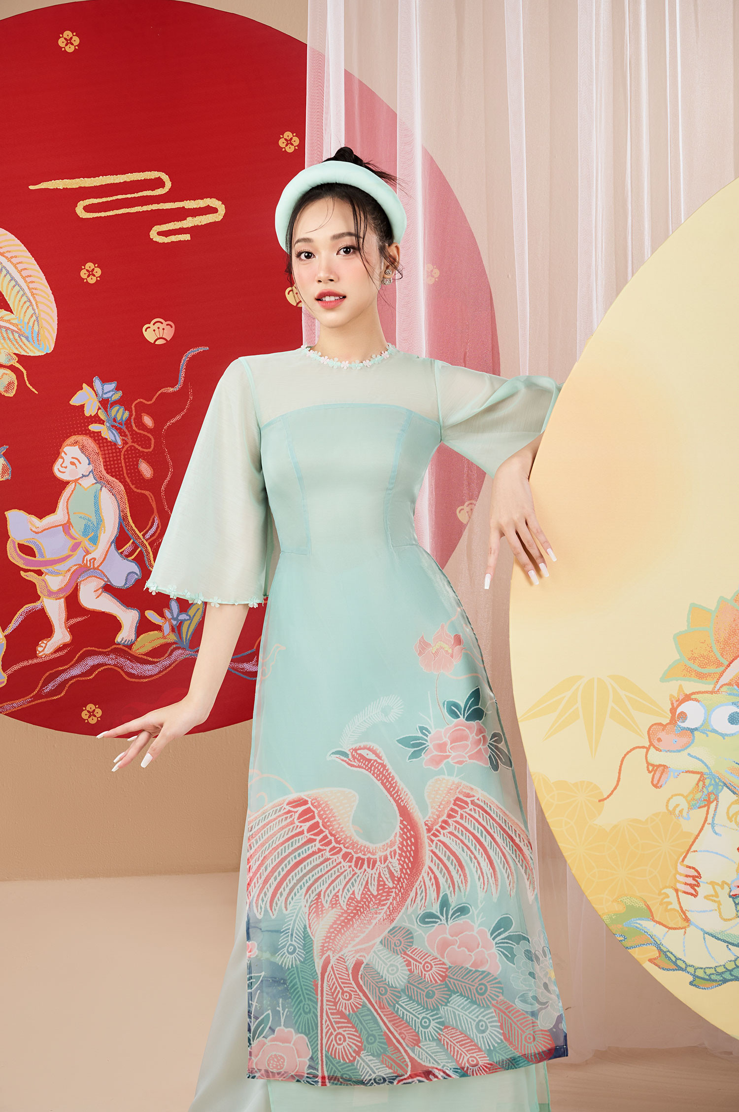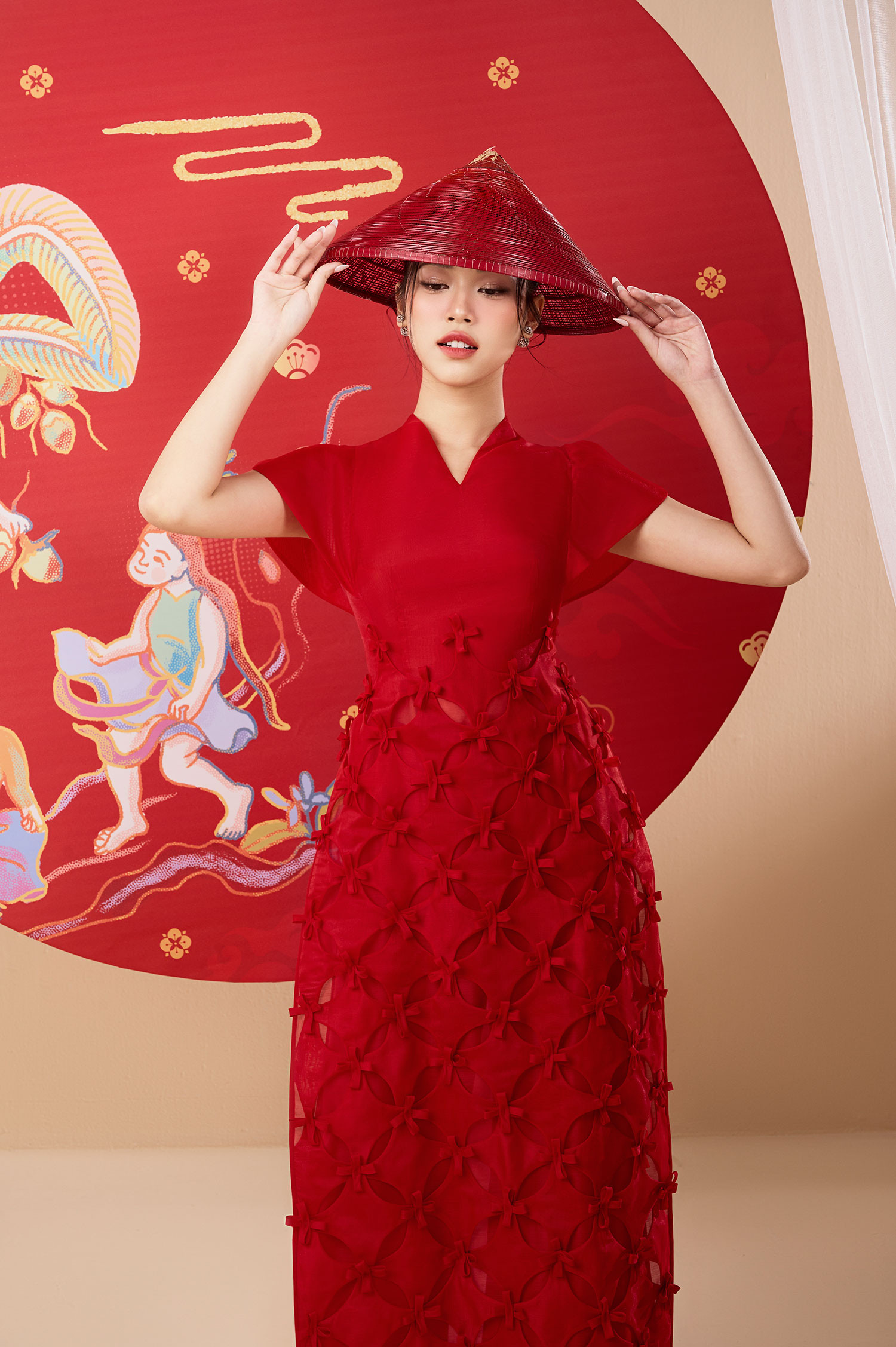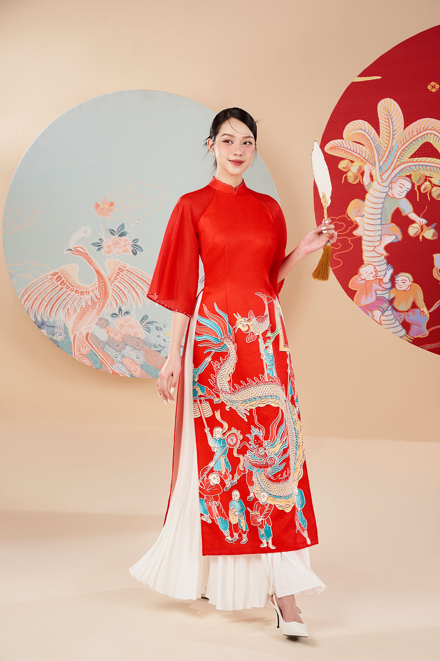 Với bộ ảnh dành cho top 3 Hoa hậu Việt Nam 2022, NTK Lê Ngọc Lâm đưa những hình ảnh cổ truyền đặc trưng ngày Tết lên tà áo dài, tạo nên những bức họa sinh động trên trang phục mang hàm nghĩa về sự sung túc, ấm no. Anh sử dụng nhiều họa tiết chim muông, rồng phượng, hoa sen hoa đào... làm chủ đạo cho bộ sưu tập.