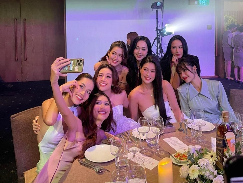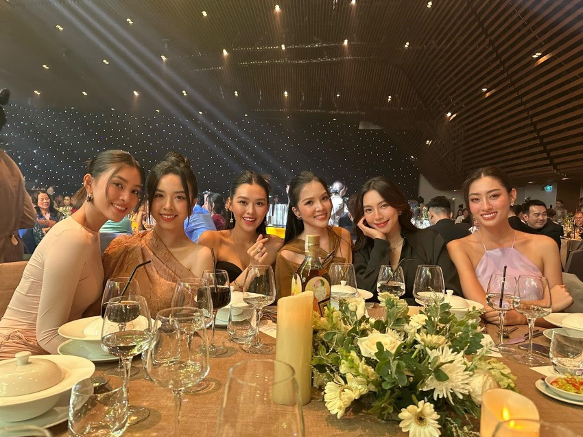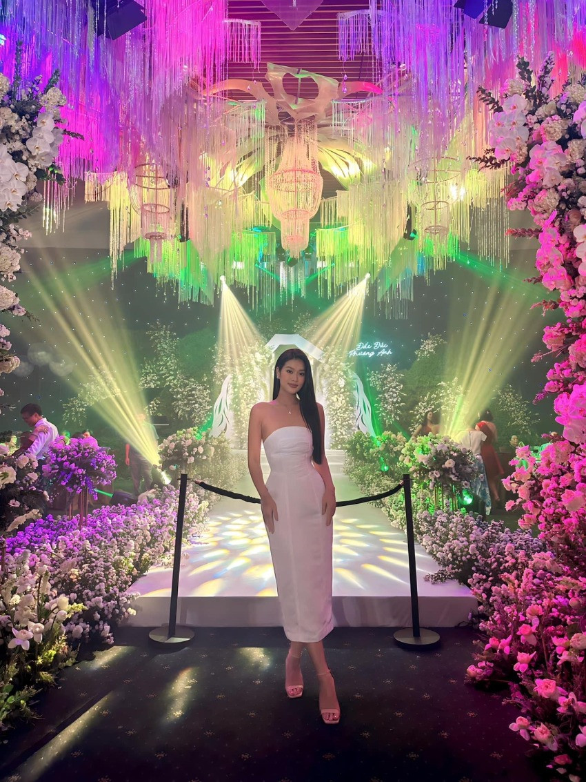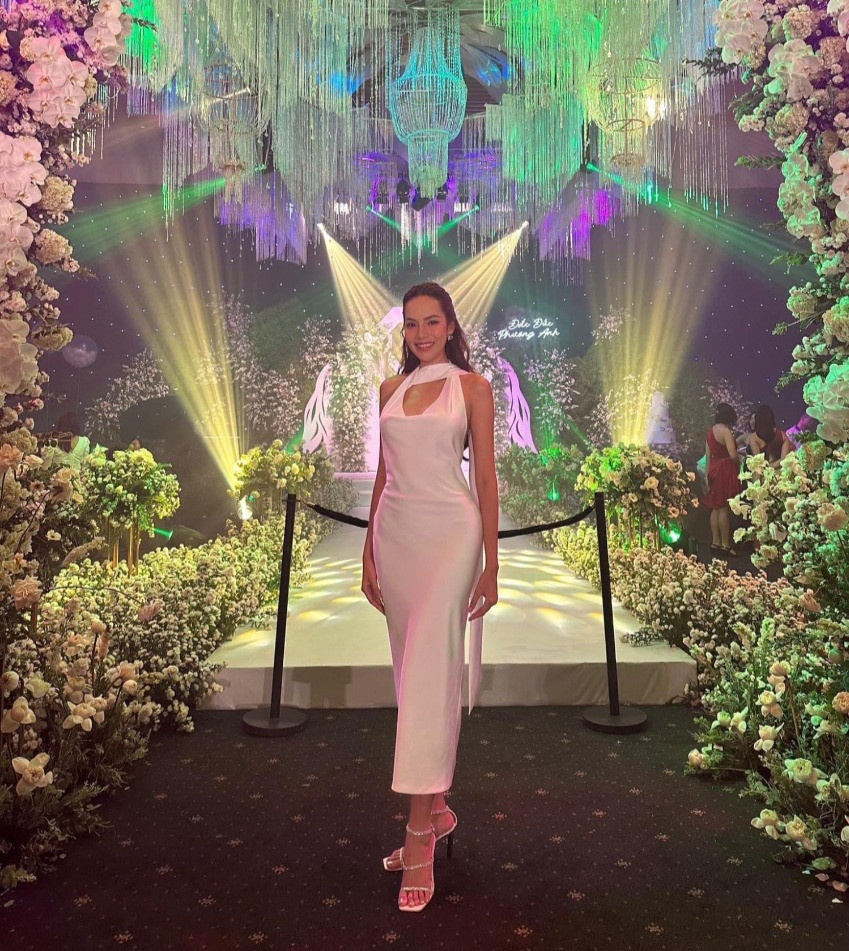 Trên trang cá nhân tối 17/9, Hoa hậu Khánh Vân đăng ảnh dự tiệc cưới Á hậu Phương Anh và chồng doanh nhân. Cô viết: "Chúc mừng hạnh phúc em gái Phương Anh. Yêu thương em!"Hoa hậu Đỗ Thị Hà diện chiếc đầm màu hồng thanh lịch, điểm nhấn ở phần đùi xẻ cao khoe đôi chân dài 1,11m. Cô tham dự tiệc cưới từ sớm, gửi lời chúc mừng đến Á hậu Phương Anh. Hoa hậu Đoàn Thiên Ân xuất hiện cùng chiếc đầm trắng dáng ôm sát, khoe vai trần eo thon. Người đẹp lưu lại khoảnh khắc lộng lẫy trong đám cưới của đàn chị. Hoa hậu Lê Hoàng Phương rạng rỡ tham dự hôn lễ của Á hậu Phương Anh. Cô lựa chọn chiếc đầm trắng cách điệu ở phần cổ, kết hợp tông trang điểm nhẹ nhàng toát lên vẻ dịu dàng, tinh tế. Hoa hậu Tiểu Vy, Á hậu Thuý An, Á hậu Tường San, người đẹp Huỳnh Thúy Vi, Hoa hậu Thuỳ Tiên, Hoa hậu Lương Thuỳ Linh (từ trái qua) cùng góp mặt chúc phúc cho cặp đôi Phương Anh - Đắc Đức.